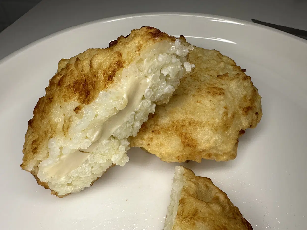 Prendiamo il riso. Se è condito con olio o qualche altro condimento e non risulta appiccicoso, ma tende a sfaldarsi, aggiungete un po’ di acqua. Mescolate bene con un cucchiaio. Adesso cercate di appiattirlo tra le mani ( come nel video) e inserite il pezzo di formaggino. Fatto questo richiudete con altro riso. Passatelo nella pastella. Mentre fate questa operazione mettete dell’olio ( alto oleico) in una padella. Appena l’olio sarà bollente ( 170 gradi) calate le frittatine nell’olio. Ci vorranno circa 3 o 4 minuti a lato. Appena prende un colore d’orato, togliete e fate asciugare. Ovviamente noi abbiamo usato il formaggino perché quello avevamo in casa, voi potete scegliere il tipo di formaggio che volete.