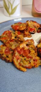 Grattugia la zucchina, strizzala bene tra le mani per eliminare l’acqua in eccesso. Taglia a cubetti i pomodorini e trita finemente il cipollotto. In una ciotola unisci le verdure con parmigiano, sale, pepe e basilico spezzettato. Aggiungi la farina e poca acqua, quanto basta per ottenere un composto compatto, ma non liquido. Tutti gli ingredienti devono legarsi bene tra loro. Ungi una teglia con un filo d’olio (meglio evitare la carta forno perché tende ad attaccarsi). Con un cucchiaio forma dei mucchietti d’impasto e adagiali sulla teglia. Spruzza o spennella un po’ di olio sopra le frittelle. Cuoci in forno preriscaldato o in friggitrice ad aria a 190°C per circa 20 minuti. A metà cottura controlla e girale se necessario. Devono risultare dorate e croccanti. Servile calde con salsa allo yogurt o formaggio spalmabile: vedrai che non riuscirai a fermarti alla prima!