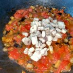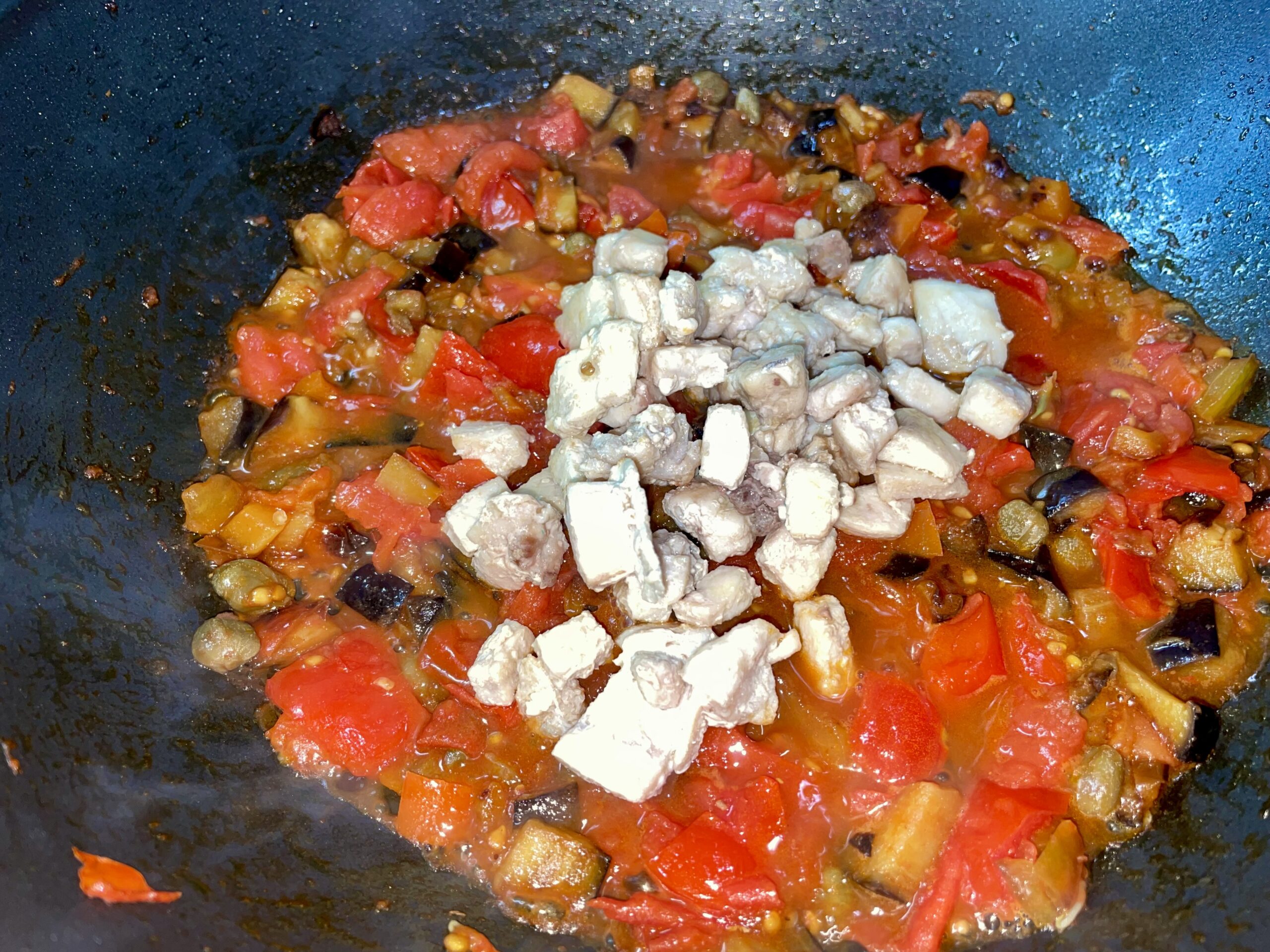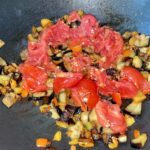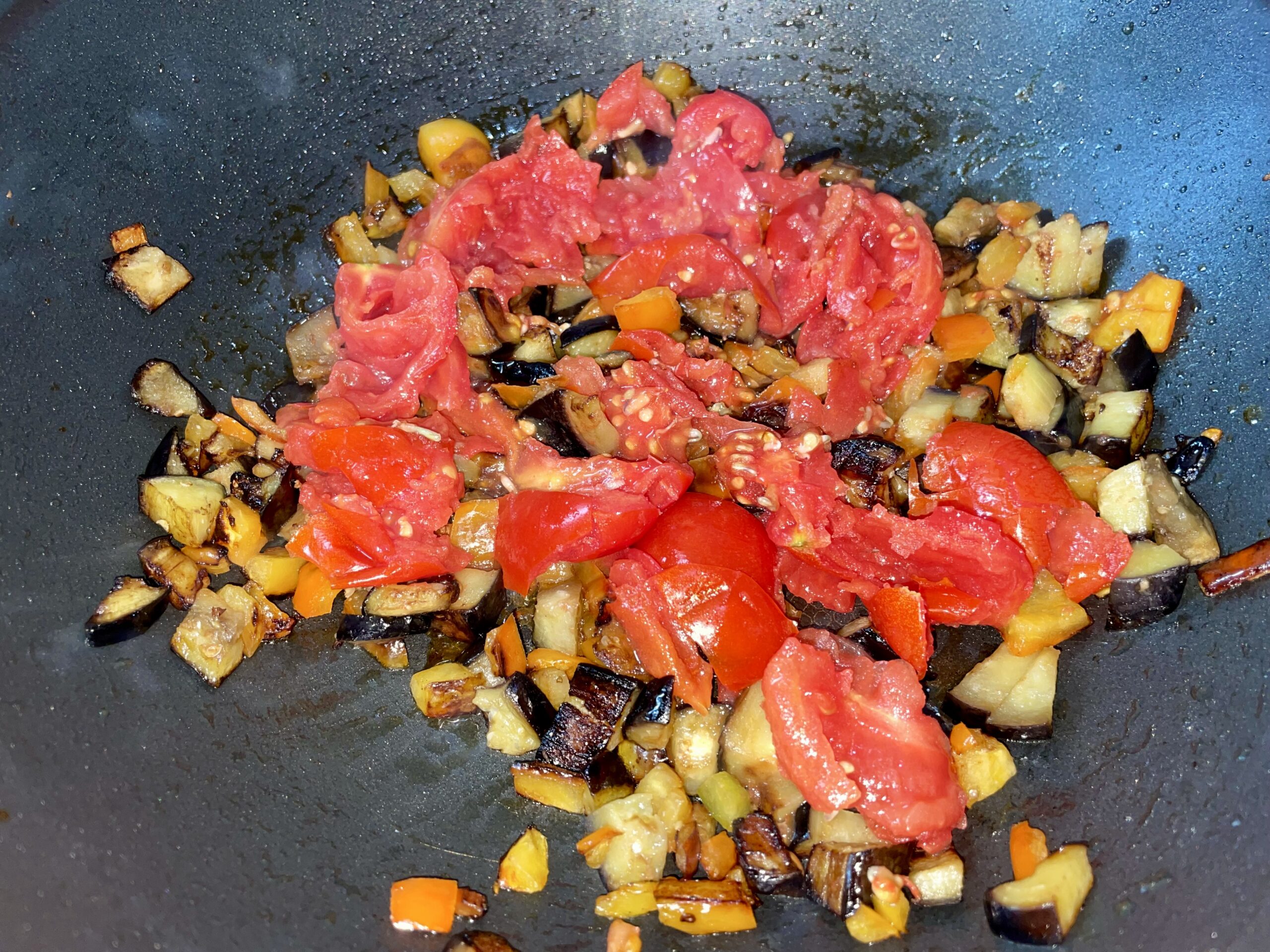 Nella stessa padella aggiungete il peperone e la melanzana, iniziate a cuocere a fiamma viva per circa cinque minuti, mescolando un paio di volte. Poi aggiungete i pomodorini tagliati in quattro, e cuocete per altri cinque minuti sempre mescolando.