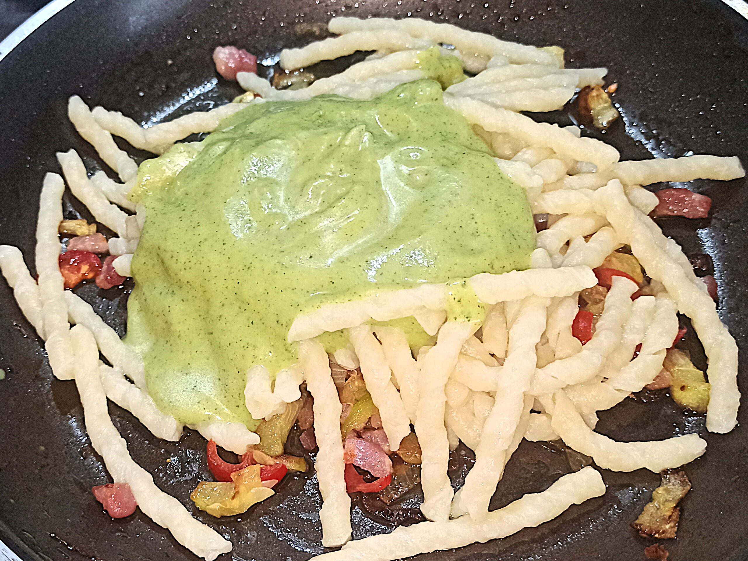 Colate la pasta al dente direttamente nella padella, aggiungete anche la crema delle zucchine, mescolate a fiamma vivace.