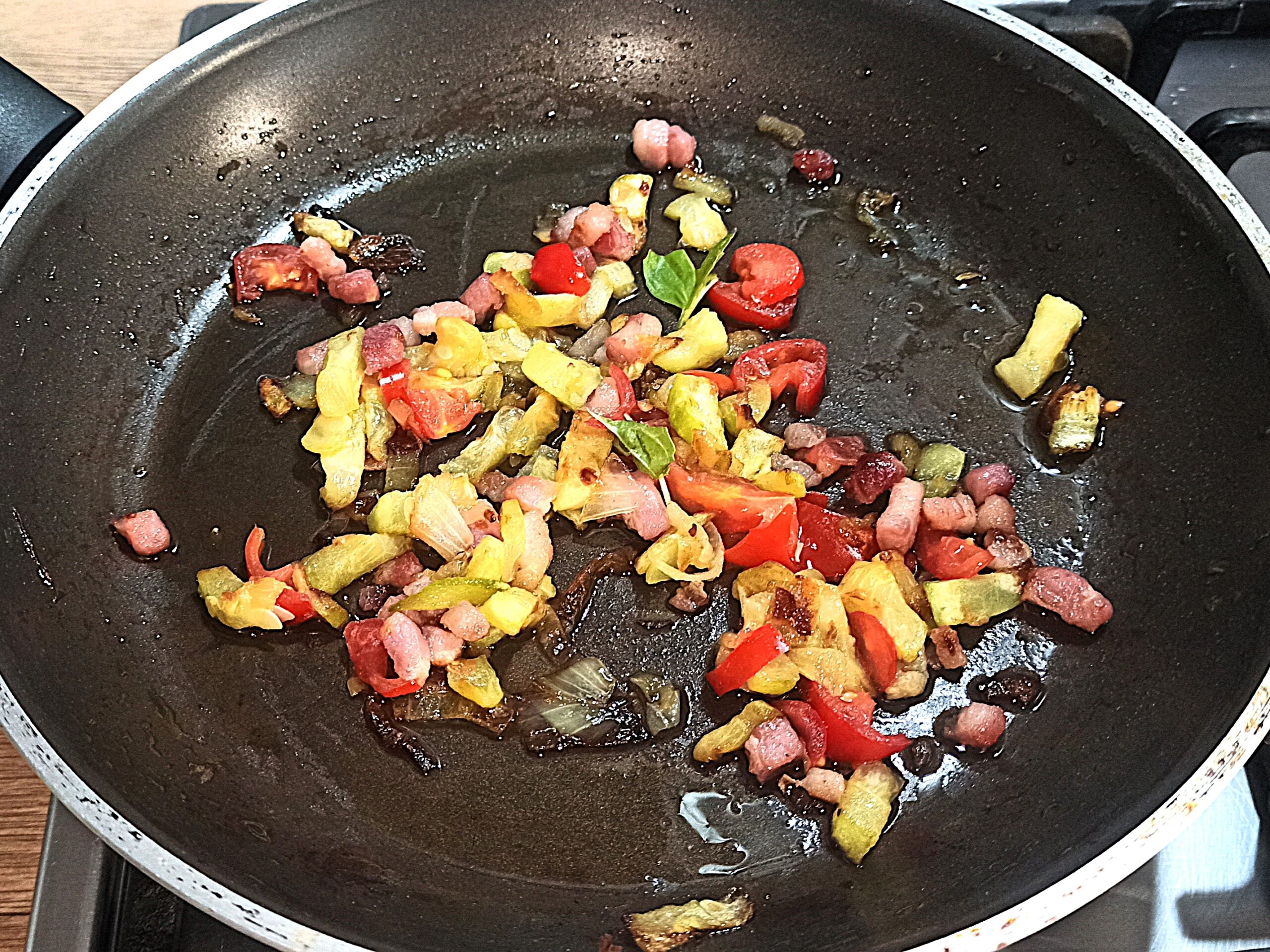 Fate rosolare per un minuto ed aggiungete anche le zucchine tagliate a cubettini, i pomodorini tagliati e fate rosolare il tutto.