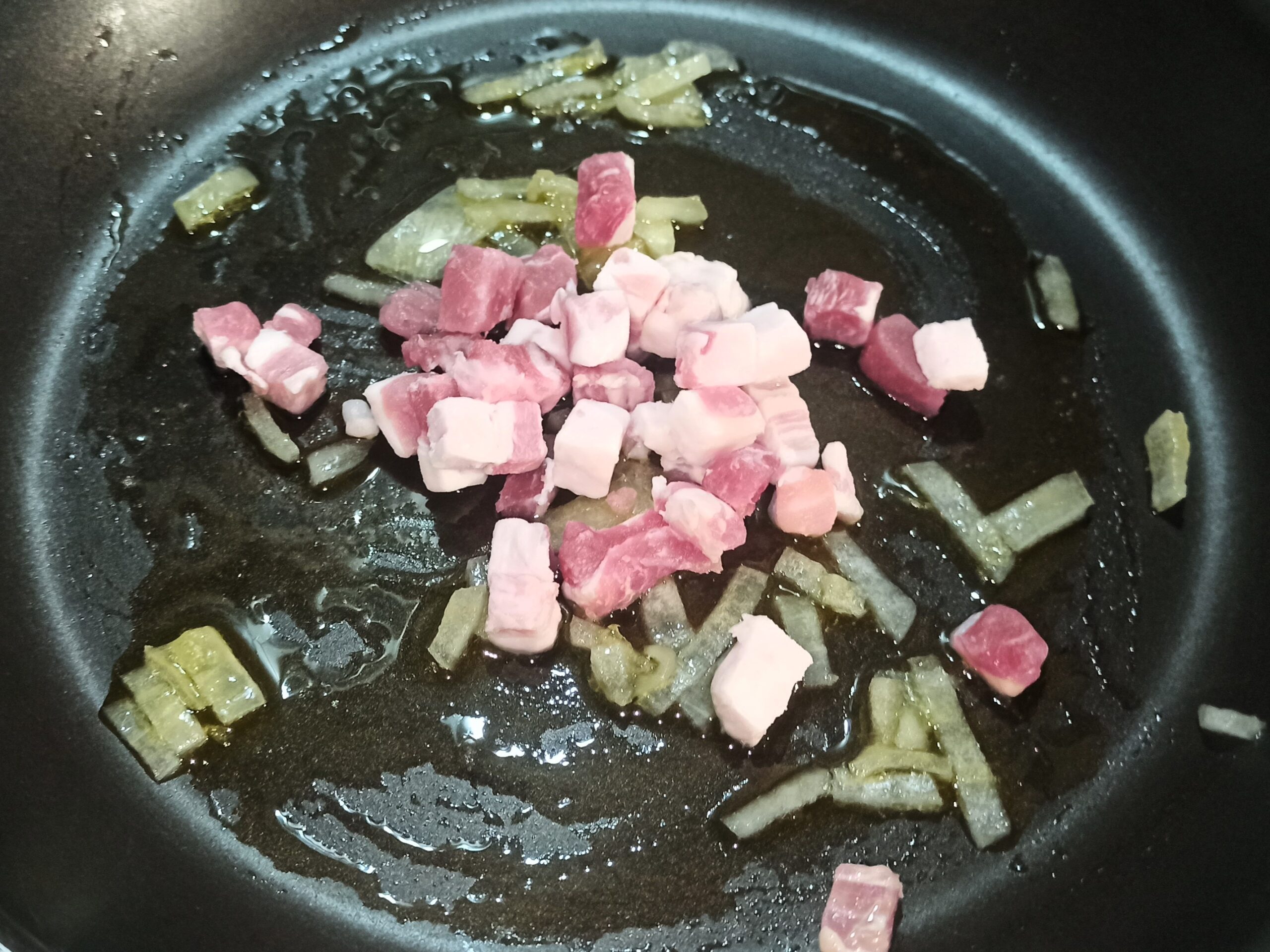 Per preparare i fusilli con le zucchine trombetta in doppia consistenza, iniziate a lavare ed asciugare la zucchina, eliminate le die estremità. Tagliate a tocchetti piccoli la parte più sottile, mentre in tre o quattro parti quella più grossa. Mettete un pentolino con acqua leggermente salata sul fuoco, appena bolle immergete le parti più grosse, e fatele lessare per tre minuti. Colatele, conservando l’acqua di cottura per cuocere la pasta, e mettetele nel bicchiere del mixer. Aggiungete un filo d’olio evo, le foglioline di basilico, frullate fino ad ottenere una crema liscia e omogenea. In una capiente padella, mettete un filo abbondante di olio evo, aggiungete la cipolla tagliata sottile, e la pancetta tagliata a cubetti.