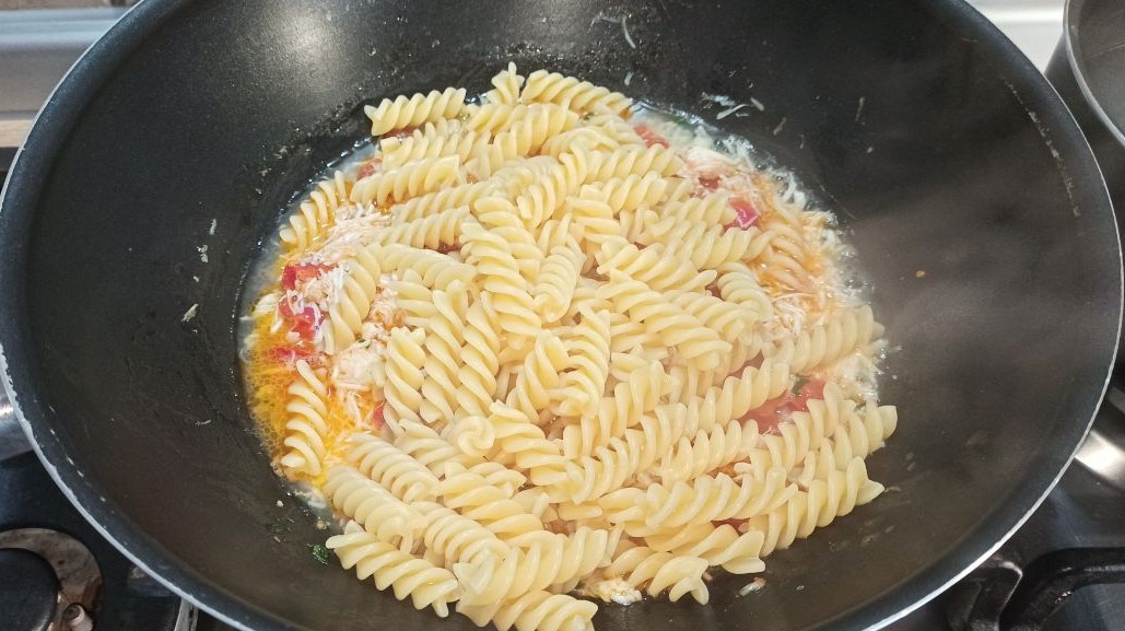 Colate al dente la pasta direttamente nella padella, spadellate a fiamma vivace.