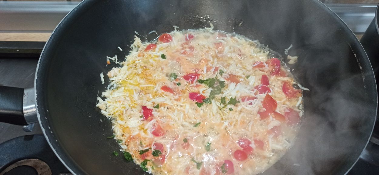 Fate cuocere per cinque minuti, aggiungete la polpa di granchio, regolate di sale.