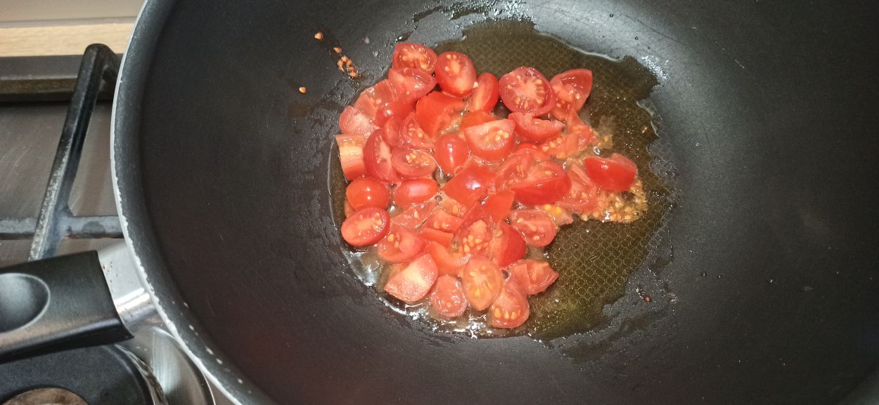 Per preparare i fusilli corti con la polpa di granchio, iniziate a recuperare la polpa dal granchio. Se avete acquistato quella in scatola, vi risparmierete sicuramente questa operazione. In una capiente padella, mettete un giro abbondante di olio evo, e fate imbiondire ed eliminate lo spicchio d’aglio. Tagliate i pomodorini, ed aggiungeteli all’olio evo, fate sfrigolare per un minuto, ed aggiungete un poco d’acqua di cottura della pasta.
