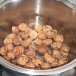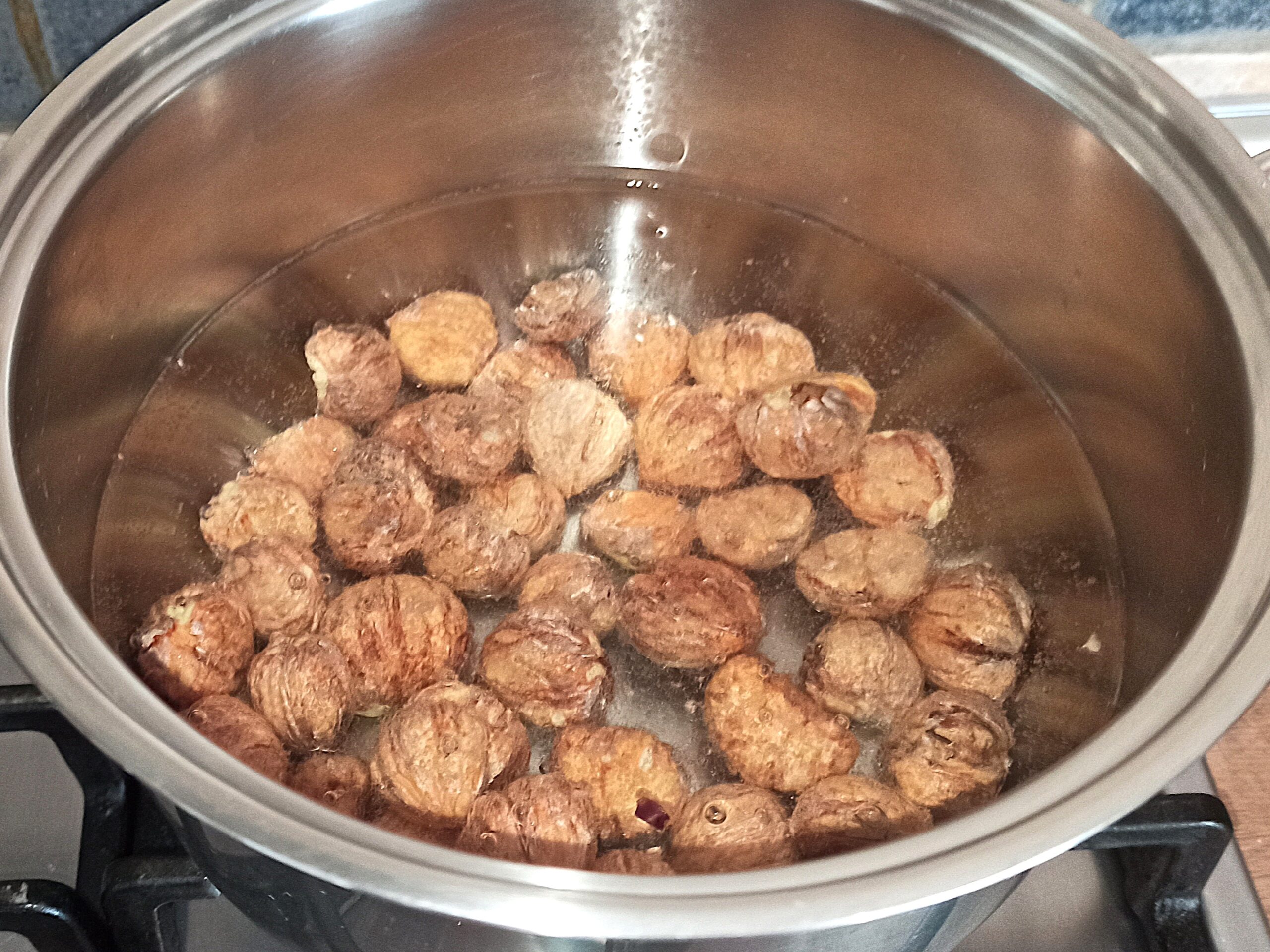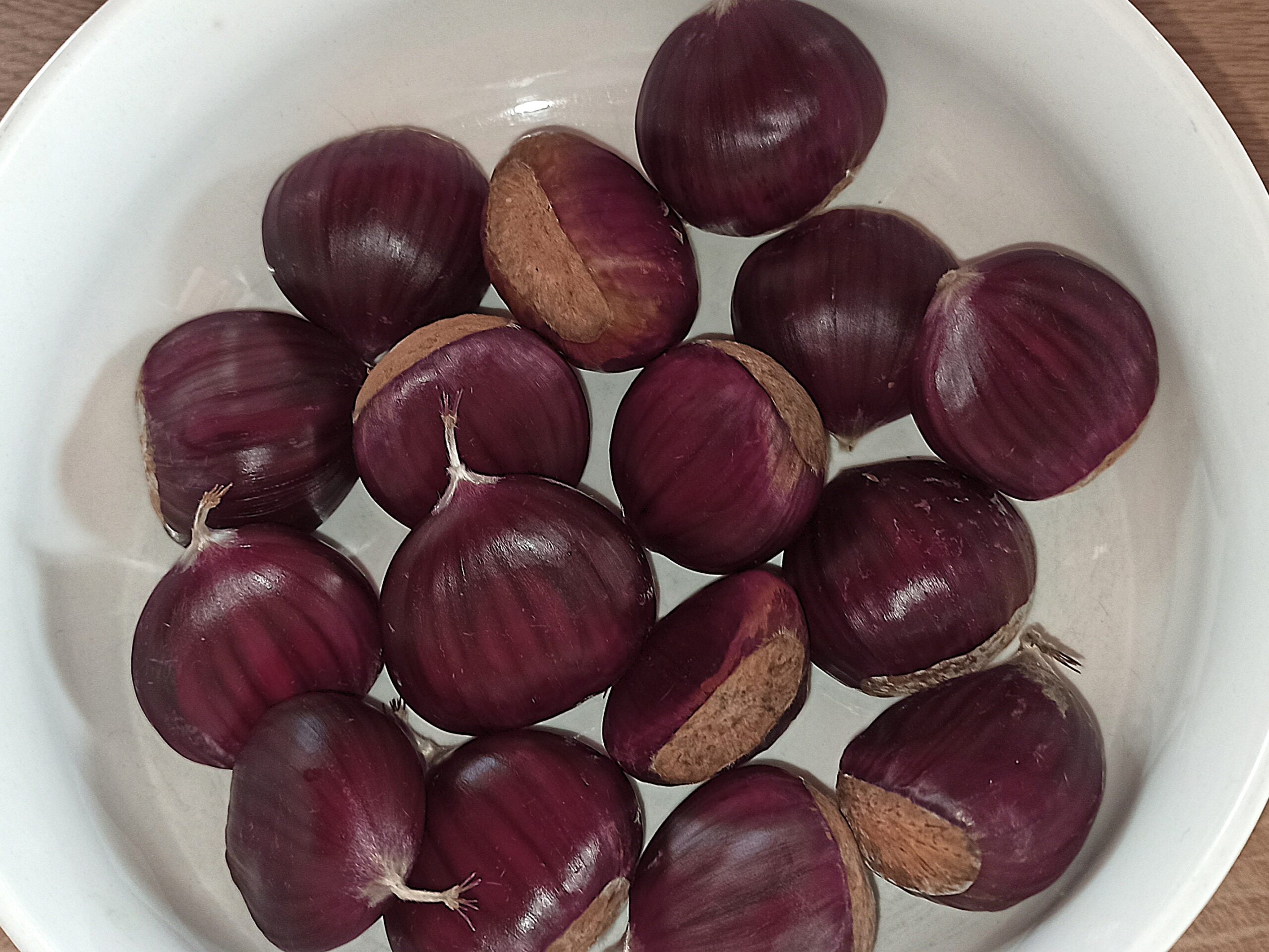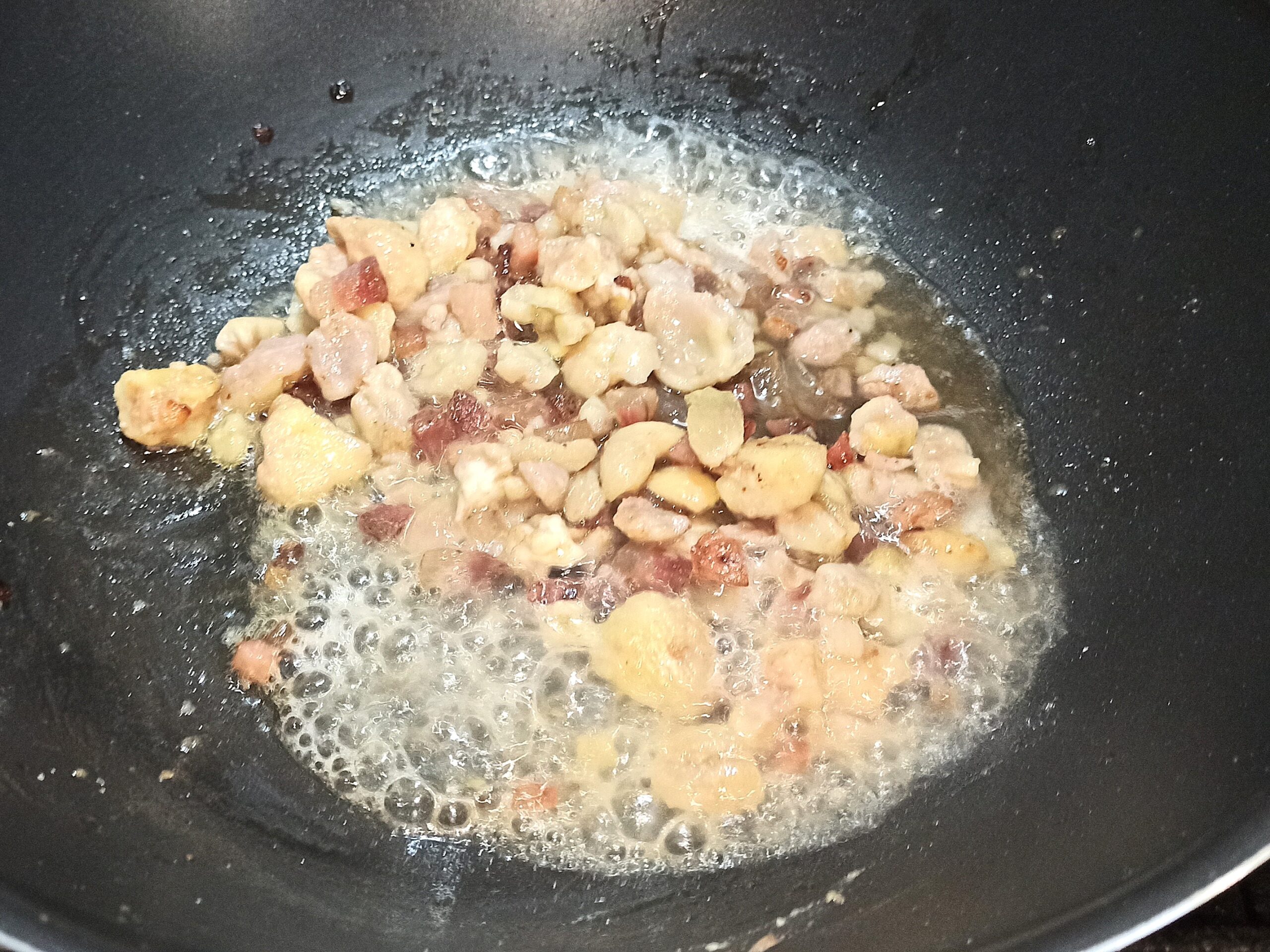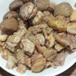 Per preparare i fusilli cremosi con pancetta e castagne, iniziate a lavare le castagne. Eliminate la buccia esterna, e lessatele per venti minuti.