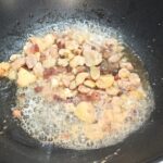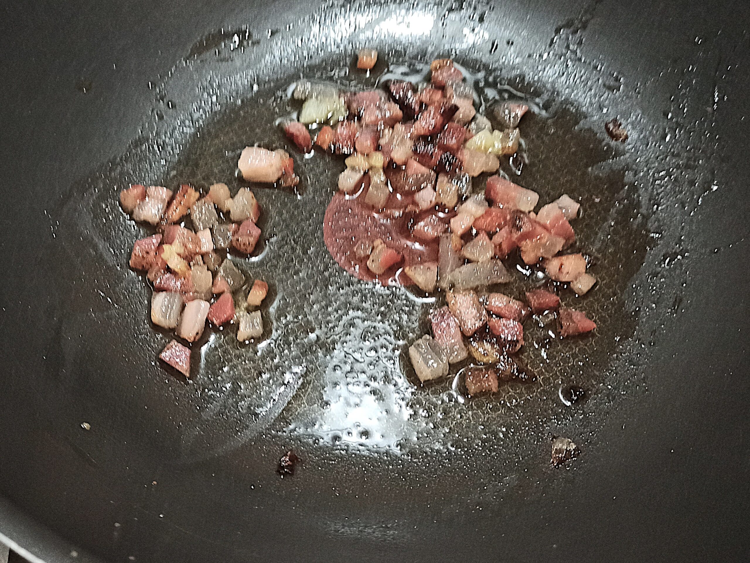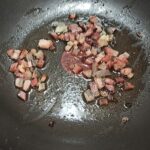 In una capiente padella, mettete la cipolla tagliata a fettine sottili, poi aggiungete la pancetta tagliata a tocchetti, e fate sfrigolare a fiamma basa, senza aggiungere ulteriori grassi.