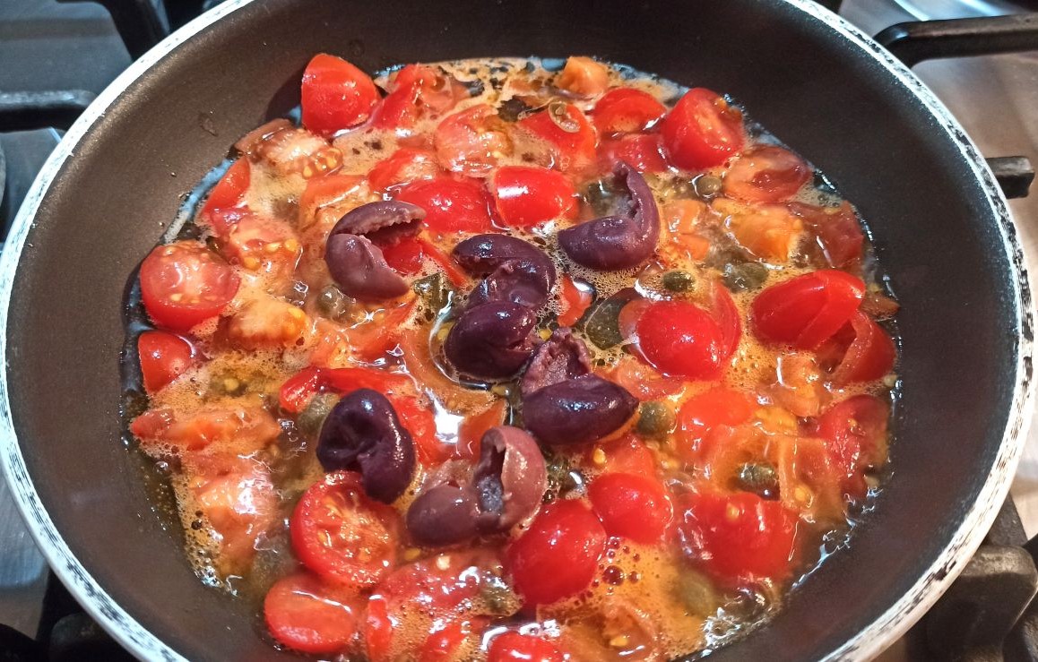 Lavate i pomodorini e divideteli a metà. In una capiente padella, mettete un apio di giri abbondanti di olio evo. Aggiungete lo spicchio d’aglio, e fatelo rosolare a fiamma media ed eliminatelo. Aggiungete i pomodorini, e fate cuocere a fiamma dolce per dieci minuti, poi aggiungete le olive denocciolate ed i capperi.