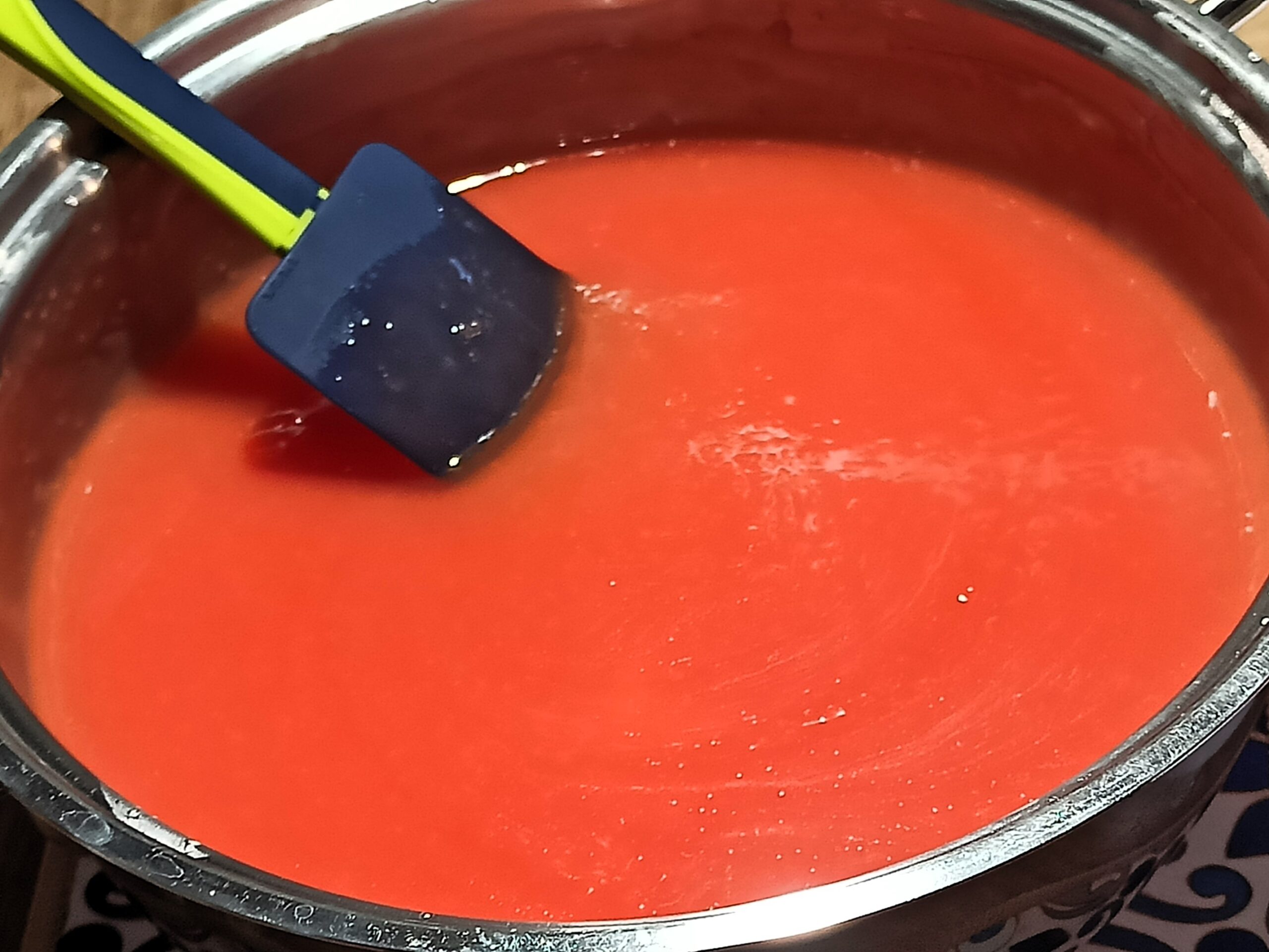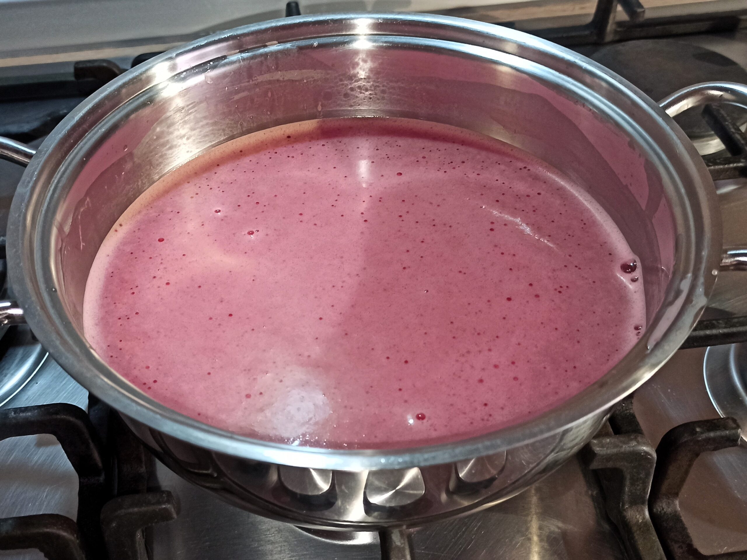 Portate ad ebollizione a fiamma dolce, sempre mescolando. Fate cuocere fino a quando il succo inizierà ad addensarsi, ed il cucchiaio/spatola, risulterà essere velato.