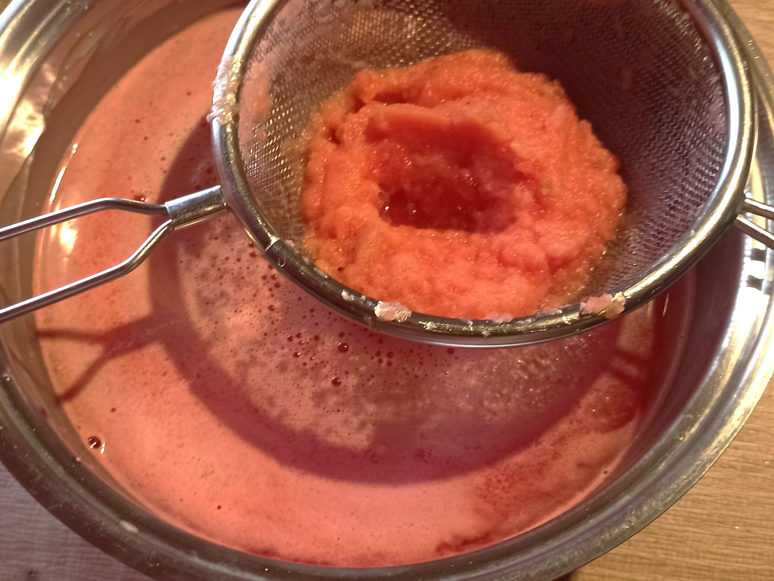 Frullate i pezzi d’anguria, filtrate il tutto con un colino a maglie strette.