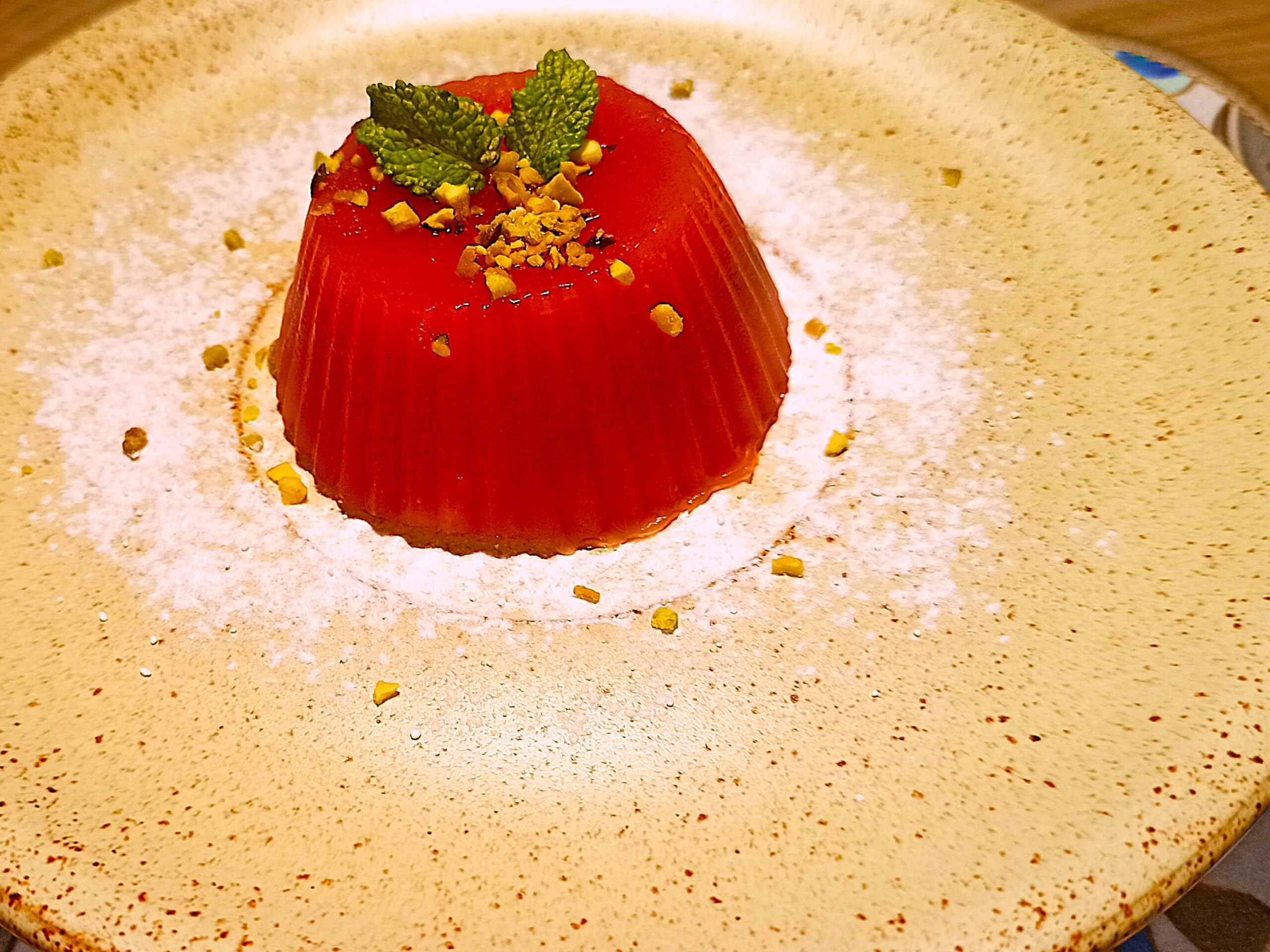 Fate raffreddare almeno un’ora a temperatura ambiente e poi sei ore in frigo. Prima di servire, cospargete il fondo del piattino da portata con lo zucchero a velo, poi posizionate sopra il Gelo di anguria, e completate con le foglioline di menta e la granella di pistacchio.