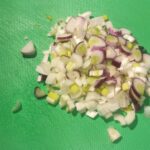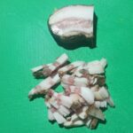 Per preparare le linguine alla Terry, iniziate a tagliare a pezzetti il guanciale.