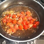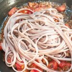 aggiungeteli nella padella, dove avete rosolato il guanciale, non occorre aggiungere ulteriori grassi, basterà quello rilasciato dal guanciale. Tagliate a metà i pomodorini, aggiungeteli nella padella, insieme a un poco d’acqua di cottura della pasta,