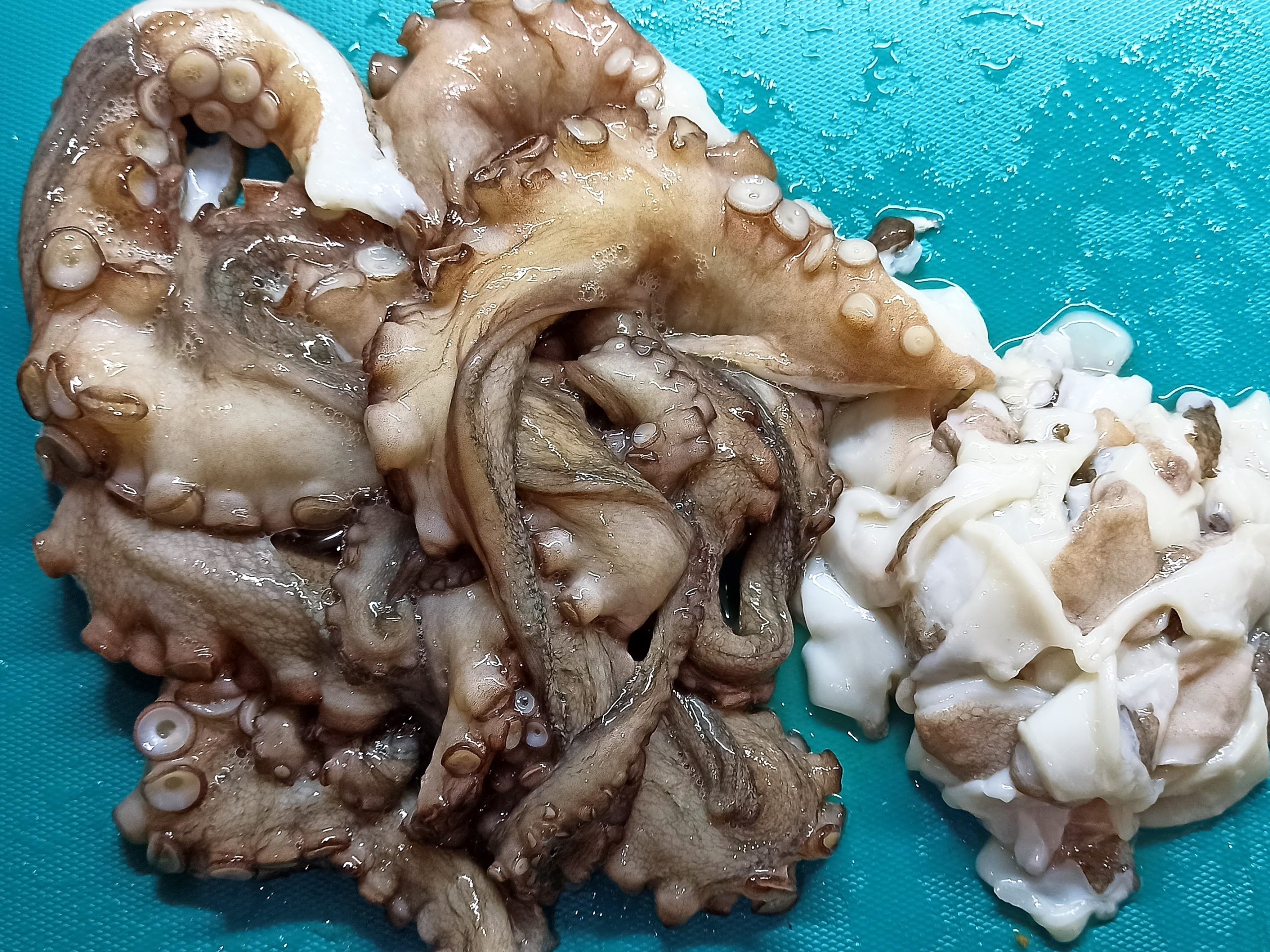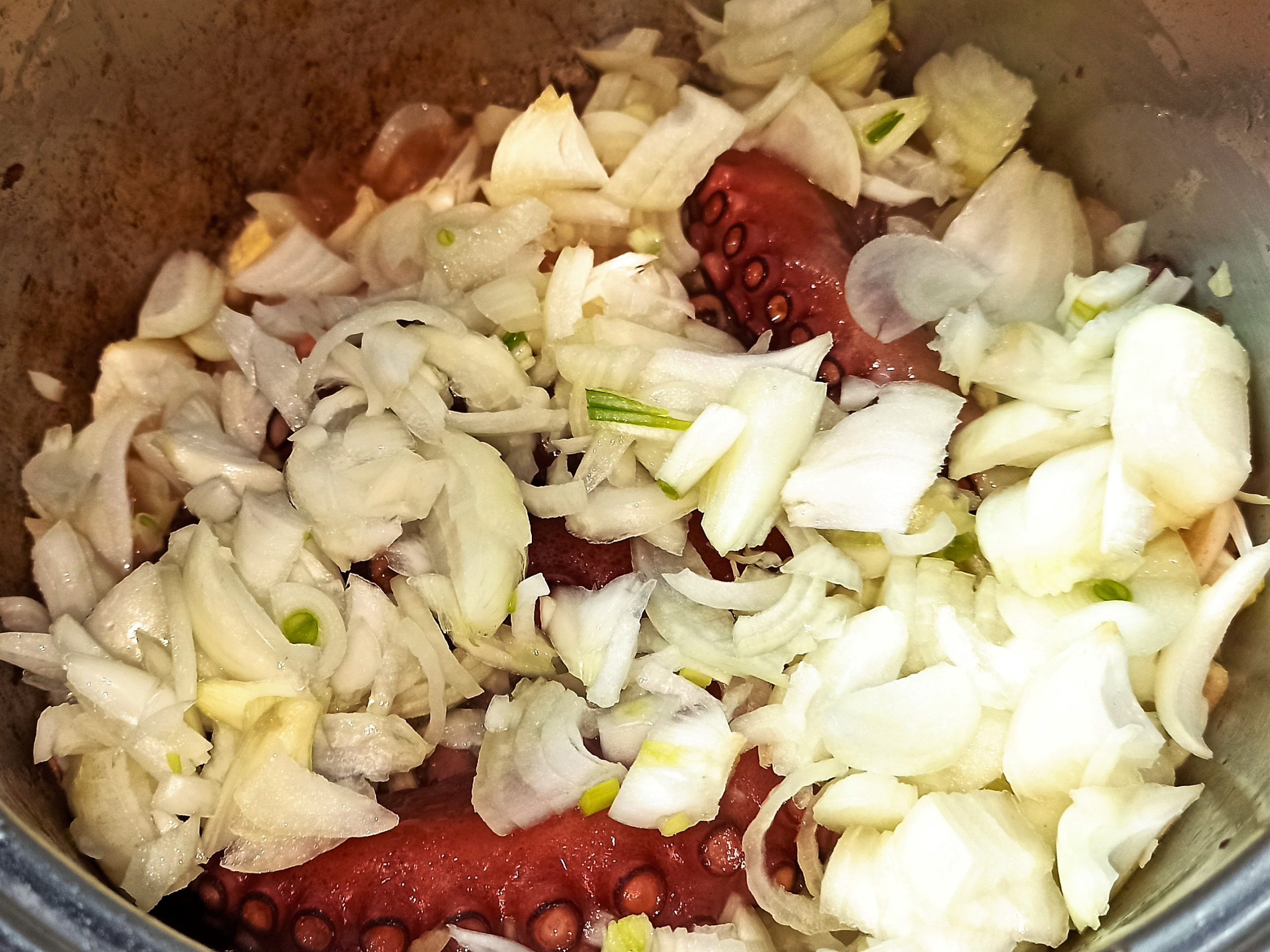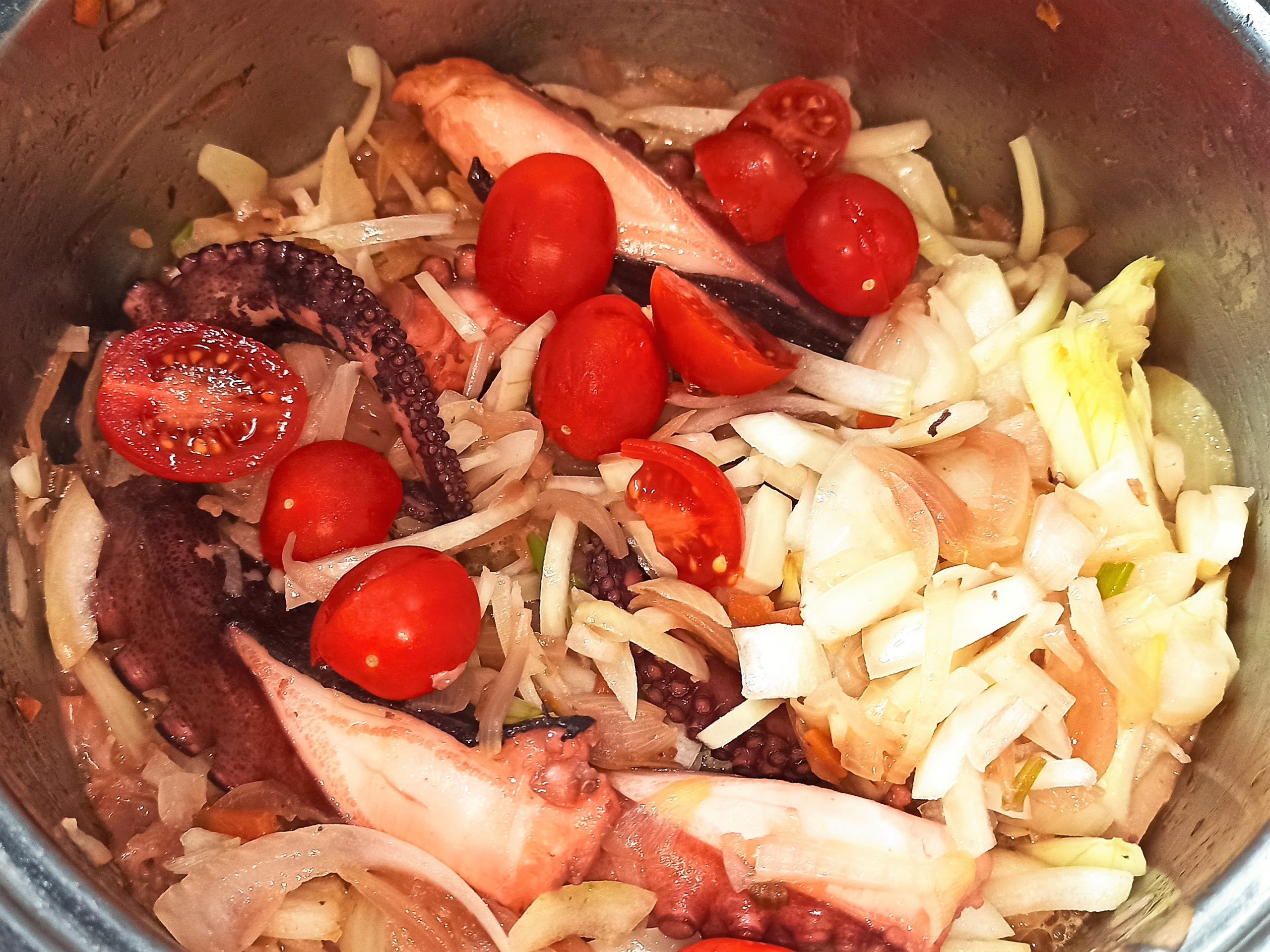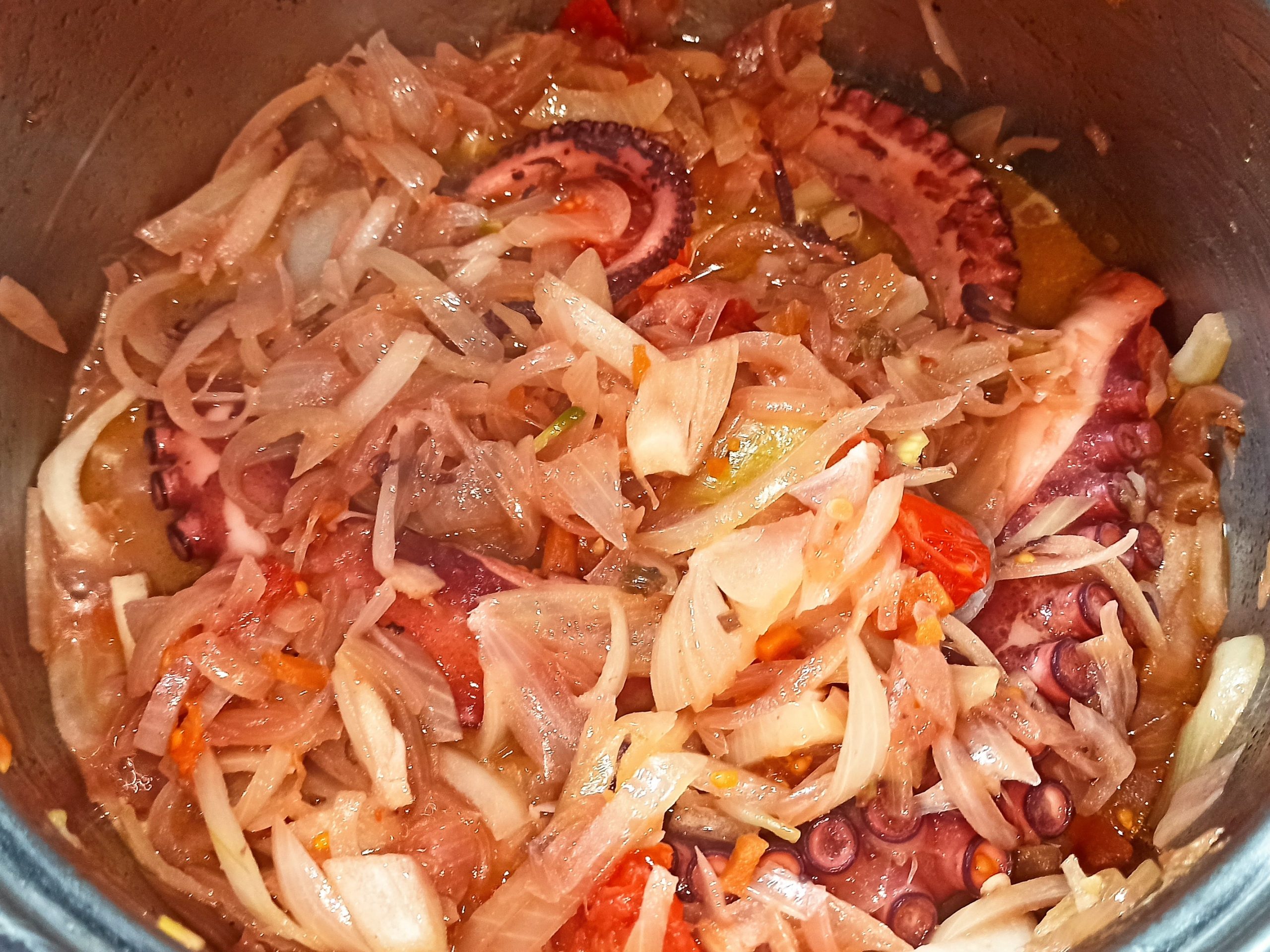 Appena l’alcol sarà evaporato, unite le cipolle, poi i pomodorini, mescolate e fate cuocere a fiamma dolce per quaranta minuti. Trascorso questo tempo, togliete i tentacoli, che vi serviranno per guarnire il piatto