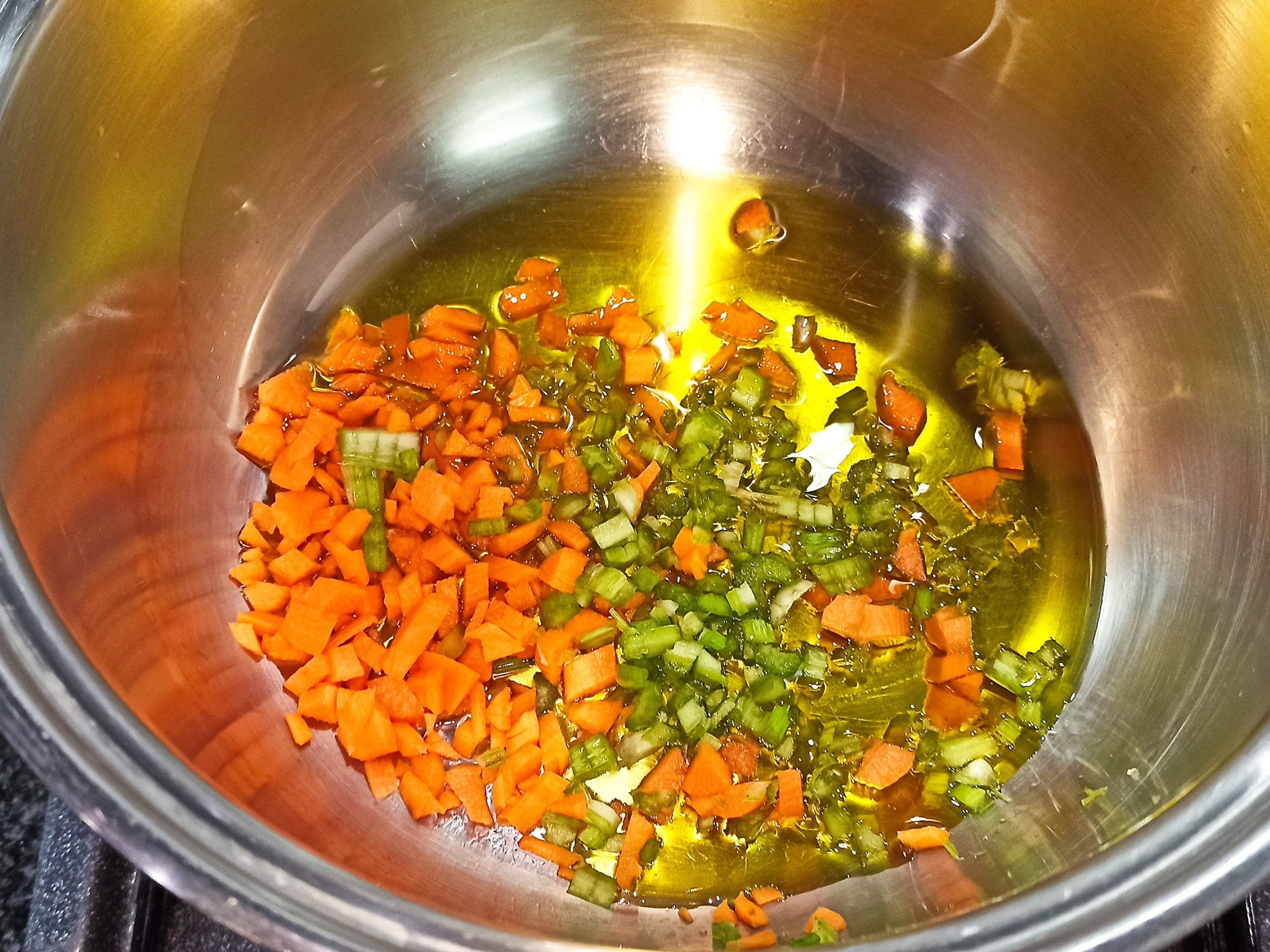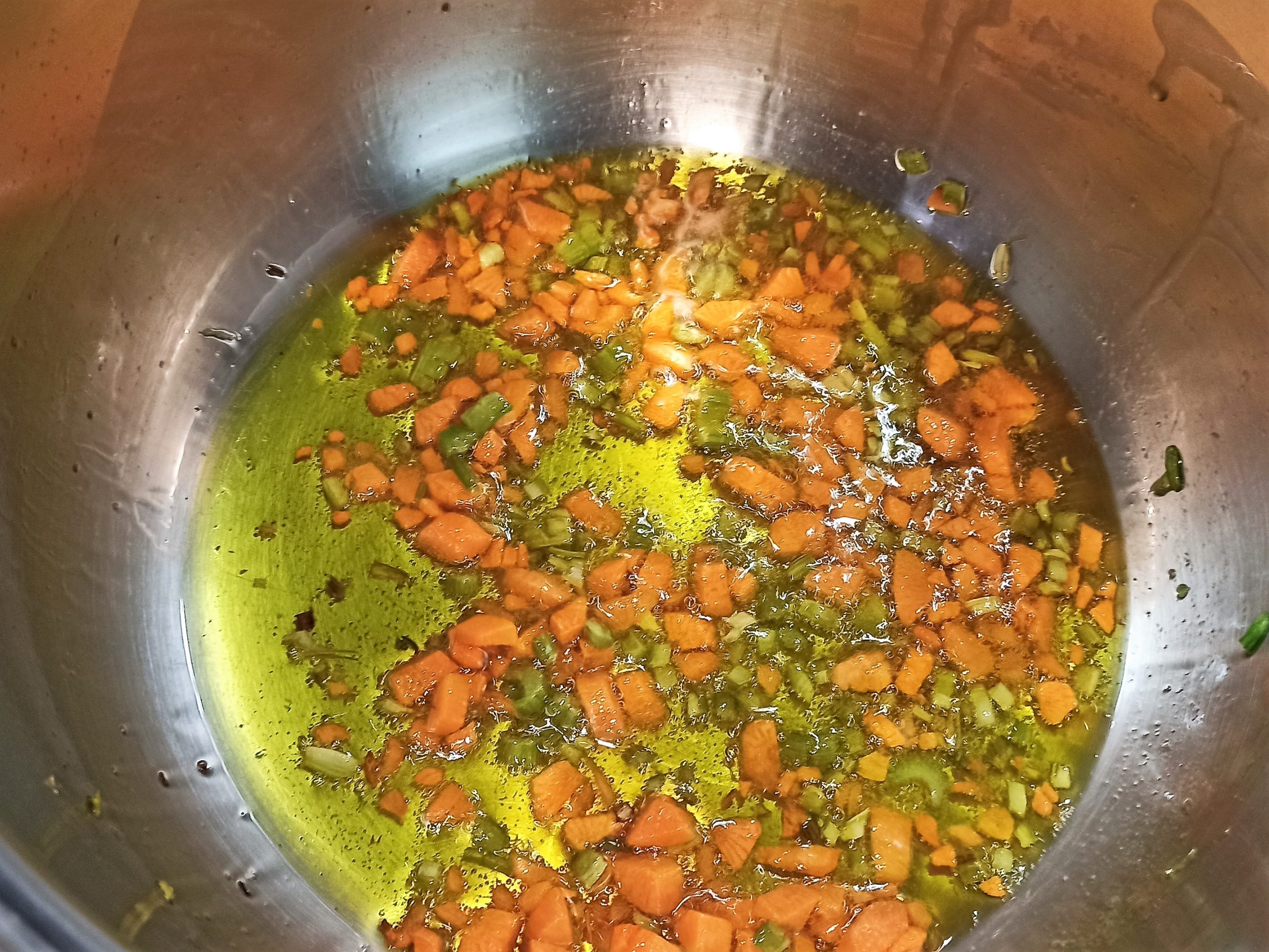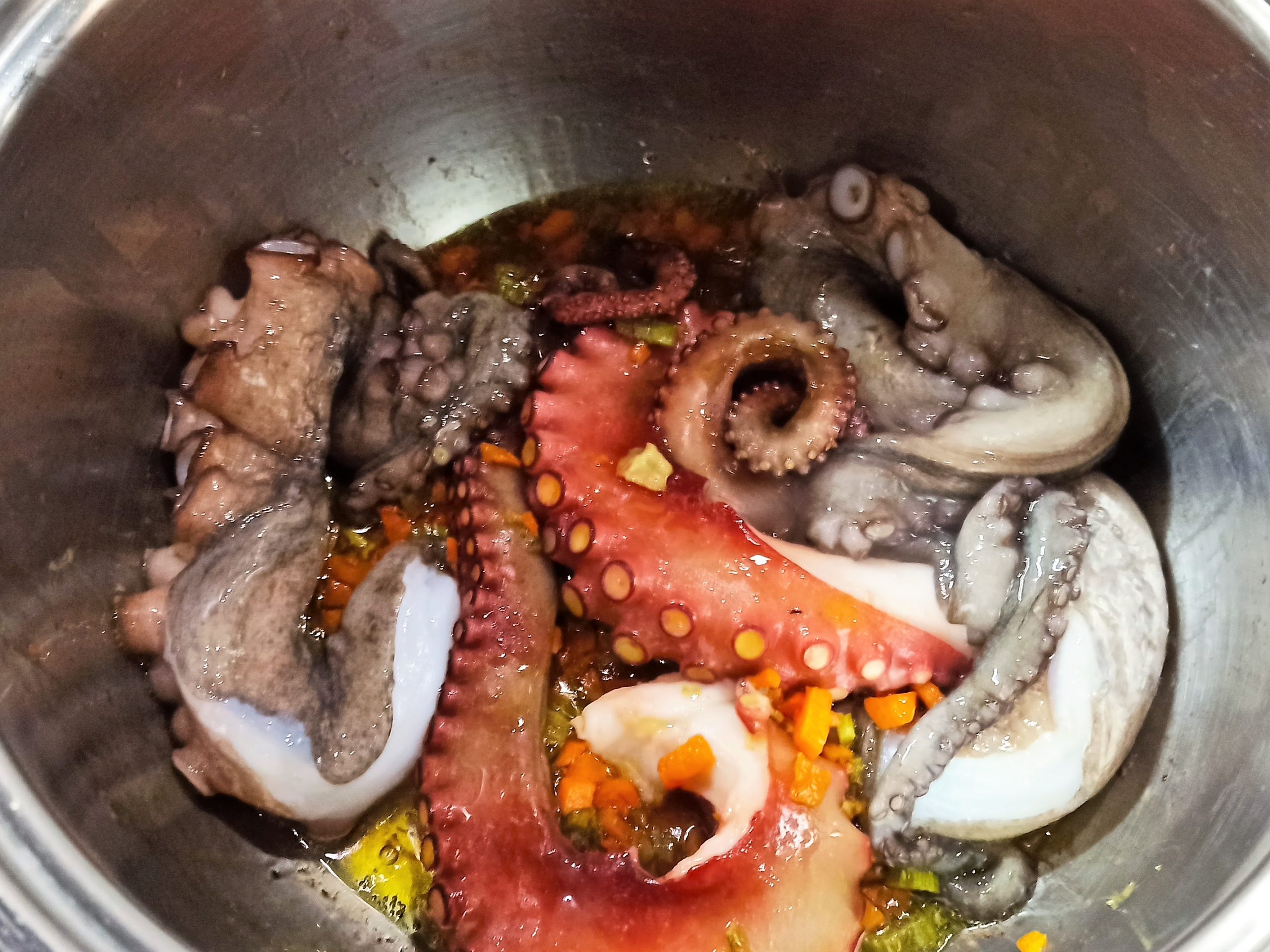 In una capiente pentola, mettete un paio di giri d’olio evo, unite le carote ed il sedano, e fate soffriggere a fiamma media. Unite il polpo a pezzetto ed i tentacoli, fate soffriggere in maniera uniforme, poi sfumate con il vino bianco.
