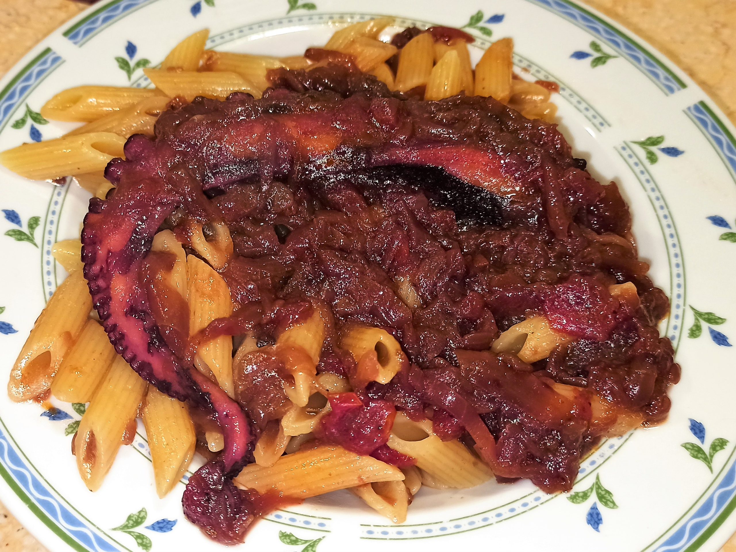 Continuate la cottura per un’altra ora, sempre a fiamma dolce, poi unite nuovamente i tentacoli, regolate di sale amalgamate e lasciate insaporire per altri dieci minuti. Cuocete la pasta al dente, colatela conditela con il sugo, impiattate completando il piatto con altro condimento e un tentacolo. Se v0lete continuate a leggere ricette sui primi piatti
