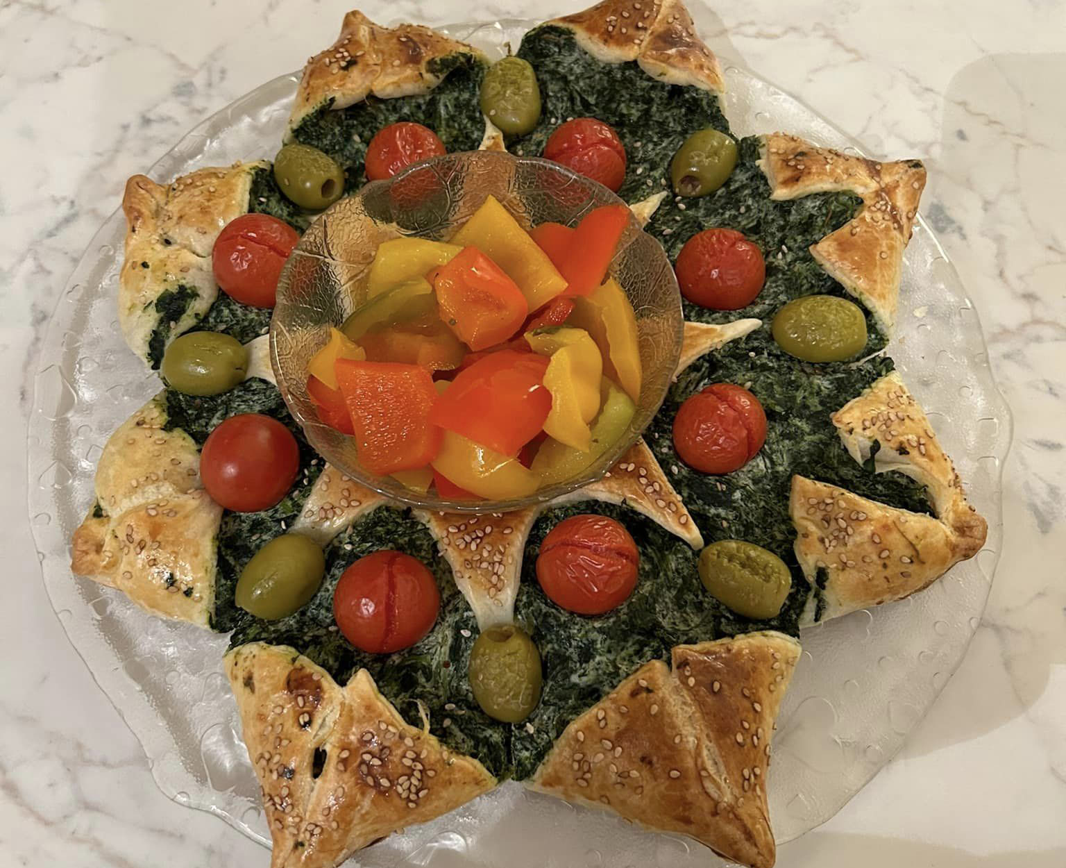 Adesso bisogna Creare le punte della stella: Con un coltello affilato, praticate dei tagli a intervalli regolari dall’esterno verso l’interno, fino a sfiorare il bordo del ripieno. Prendete ogni sezione tagliata e ruotatela leggermente verso l’alto per creare l’effetto “punta” della stella. Infine non ci resta che Decorare e cuocere: Spennellate la superficie della ghirlanda con un uovo sbatteto. Cospargete i bordi con semi di sesamo. Decorare le punte della stella e gli spazi tra una punta e l’altra con olive e pomodorini. Cuocete in forno preriscaldato a 180°C (statico) per 25-30 minuti , o fino a quando la sfoglia sarà dorata e croccanteUna volta sfornata, lasciate intiepidire la ghirlanda per qualche minuto. Posizionate al centro una ciotolina con verdure grigliate, sott’olio o altri contorni, per completare la presentazione.