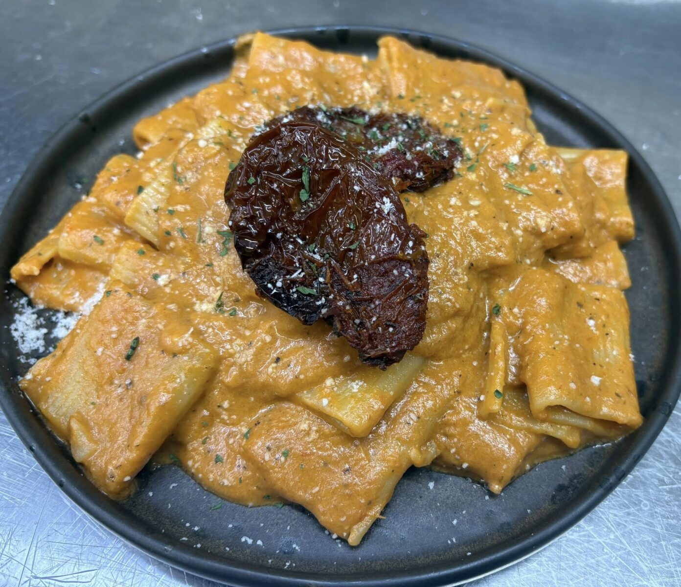 Adesso non vi resta che condire la pasta, trasferite i Gigantoni scolati in una ciotola capiente e aggiungete il pesto di pomodori secchi. Mescolate bene per amalgamare il tutto, aggiungendo, se necessario, un po’ di acqua di cottura per rendere il condimento più cremoso. Distribuite la pasta nei piatti e adagiate sopra ciascuna porzione metà burrata. Se gradite, completate con una spolverata di pangrattato tostato per aggiungere una nota croccante. Gustate i vostri Gigantoni con pesto di pomodori secchi e burrata ben caldi, accompagnati da un bicchiere di vino bianco fresco.