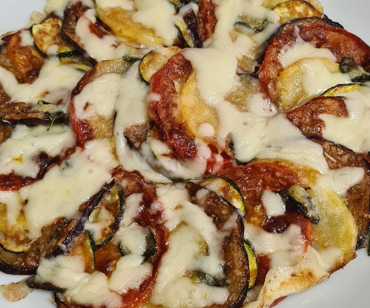 Adesso il Secondo strato: Sovrapponete un secondo strato di verdure seguendo lo stesso schema. Condite nuovamente con sale, basilico, parmigiano e olio. Aggiungere 2 cucchiai d’acqua sul fondo della teglia per mantenere le verdure morbide durante la cottura. Trasferite la teglia nella friggitrice ad aria. Cuocete a 170°C per 20-22 minuti , finché le verdure saranno morbide e leggermente dorate. A cottura ultimata, distribuire la mozzarella per pizza grattugiata sopra le verdure. Rimettete in friggitrice per 2-3 minuti, finché la mozzarella non si sarà sciolta. Portate in tavola la girandola di verdure calda, decorandola con qualche foglia di basilico fresco. Perfetta come piatto unico leggero o come contorno per una cena tra amici. Buon appetito!