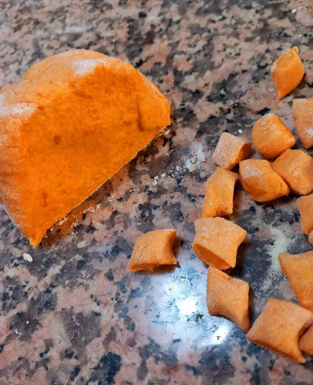 Una volta cotta mettete la zucca a scolare della sua acqua lasciandola anche raffreddare bene per poi strizzarla un pochino ( questo passaggio determinerà la quantità corretta di farina ) più scolata ed asciutta sarà la zucca meno farina ci vorrà, io ne ho usata 200 gr ( vi dovrete regolare). In una ciotola mettete la zucca, e farine un po per volta ( cosi potrete regolarvi meglio) la noce moscata e l’uovo. Lavorate fino ad ottenere un impasto compatto come per i classici gnocchi di patate. Formate dei filoncini per poi tagliarli piu o meno grandi a vostro piacimento dandogli la loro tipica forma.