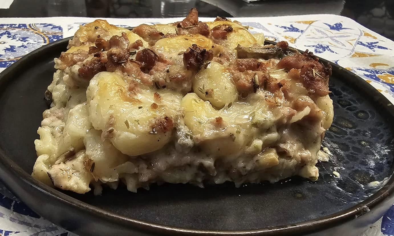 Gnocchi al forno con salsiccia, funghi e provola affumicata di bufala