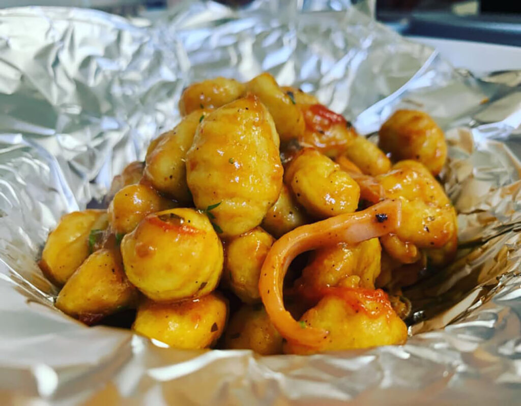 Fate cuocere per metà cottura gli gnocchi. Dopodiché, scolateli e versateli nella padella del condimento. Aggiungete anche una parte di parmigiano e di mozzarella tagliata a dadini. Mantecate per bene tutto e poi trasferite gli gnocchi in un foglio grande di carta stagnola. In superficie condite col restante parmigiano e mozzarella.