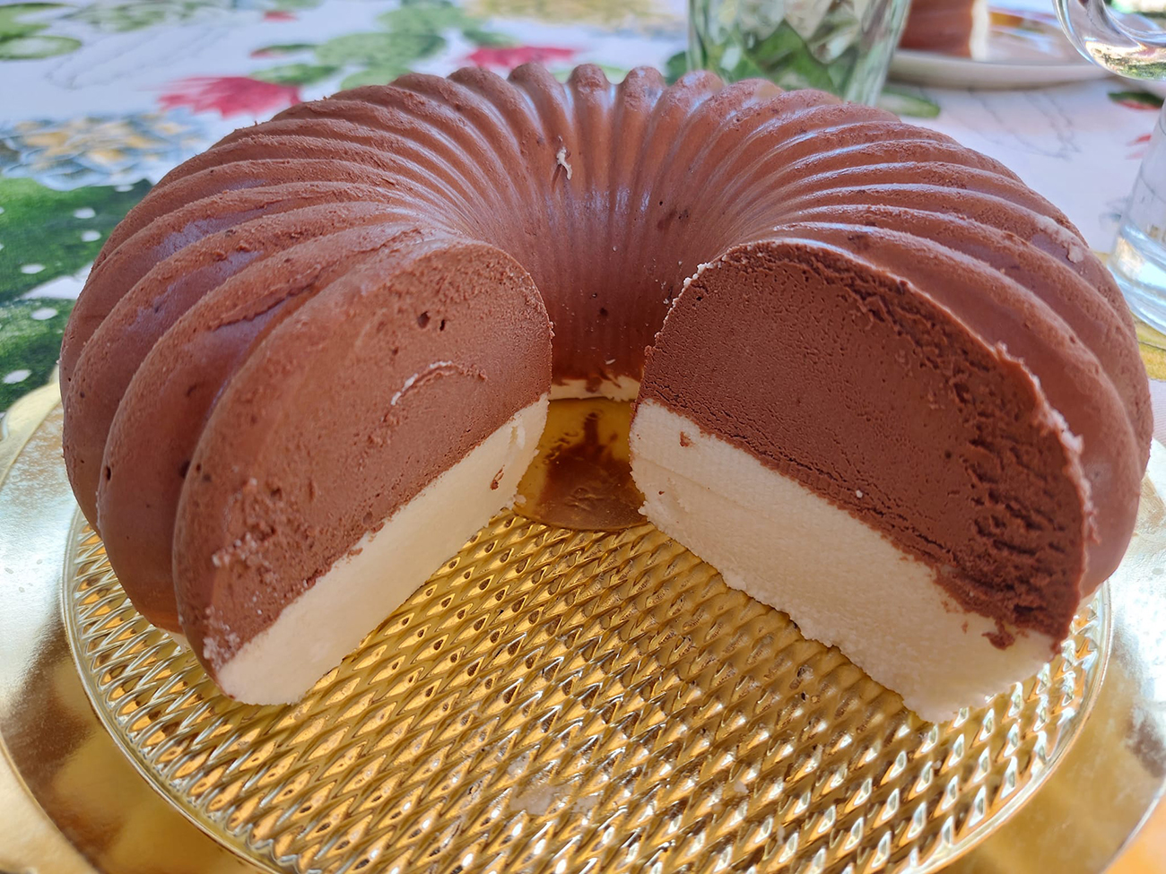 Nel frattempo montare la panna e quando il composto al cioccolato bianco avrà raggiunto la temperatura ambiente unirla mescolando delicatamente dall’alto verso il basso. Versare il composto ottenuto sopra la mousse al cioccolato fondente, e rimettere di nuovo nel freezer fino al totale congelamento. Passato il tempo, levare il dolce dallo stampo, mettere sul piatto di portata e decorare al vostro piacimento. Mettere il dolce nel frigo per almeno due, tre ore prima di servirlo.