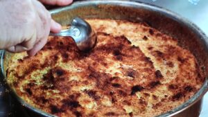 In una teglia spalmare il burro e spolverare con pangrattato. Inserire il composto ( vi accorgerete di aver fatto un buon lavoro se lo stesso composto rimarrà attaccato alla cucchiarella). Spalmare il composto stesso e poi coprire con pan grattato e delle noci di burro ( 4 o 5).