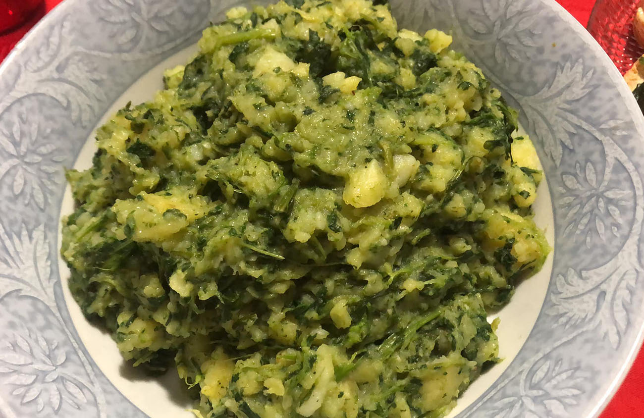Fate scaldare un giro di olio extravergine di oliva. Fate rosolare uno spicchio di aglio schiacciato insieme al peperoncino fresco. Quando l’aglio sarà ben dorato, potete unire le patate. Lasciatele insaporire e cominciate a schiacciarle aiutandovi con una forchetta. Unite anche le cime di rapa. Aggiustate di sale e date una bella mescolata per amalgamare gli ingredienti. Il vostro contorno mallone è pronto. Potete servirlo come piatto unico vegetariano oppure utilizzarlo per accompagnare un secondo di carne o di pesce.