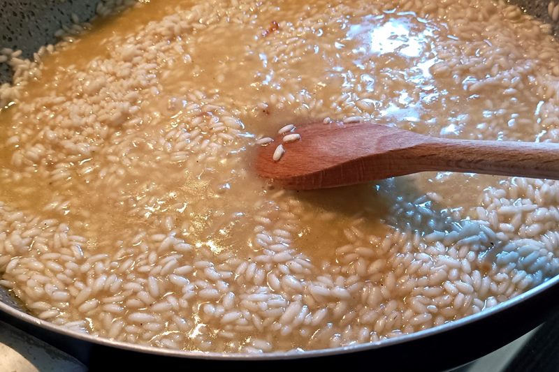 Ultimate la cottura per qualche minuto: il risotto dovrà essere cotto e quasi asciutto;