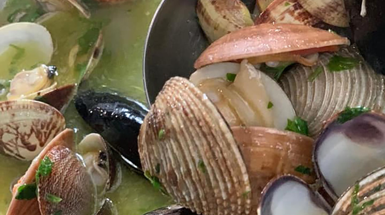 In una pentola larga soffriggete l’aglio tagliato a metà e privato dell’anima in 25 ml di olio extravergine di oliva. Quando è dorato eliminatelo e aggiungete il peperoncino secco e, subito dopo, tutti i molluschi. La fiamma deve essere al massimo e aggiungiamo il vino bianco. Copriamo tutto con un coperchio. Quando sono tutti aperti spegnete la fiamma. Aggiungete pepe nero. Mescolate bene in modo da condire uniformemente e servite. Il piatto deve essere servito con pane tostato ( magari in forno per qualche minuto).