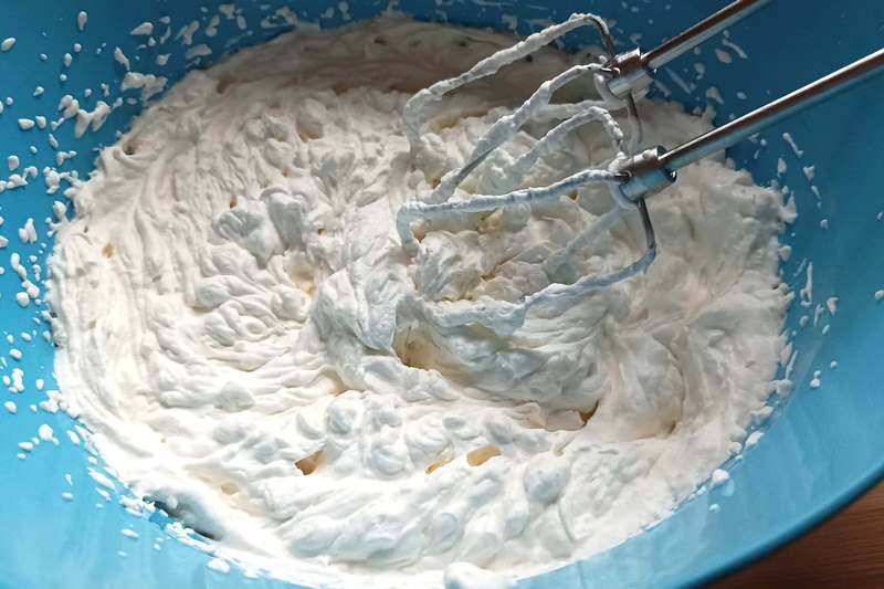 In una ciotola montate la panna, a parte frullate il mascarpone con lo zucchero, ed aggiungete la panna montata poco per volta, continuando a frullare fino ad ottenere una crema densa e corposa.