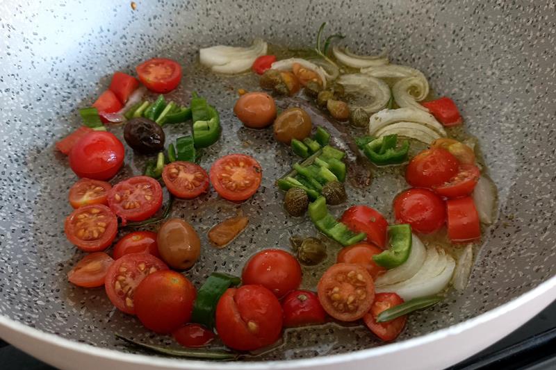 unite infine i pomodorini, capperi e olive e mescolate il sugo: potete dare una nota pungente aggiungendo peperoncino fresco o secco.