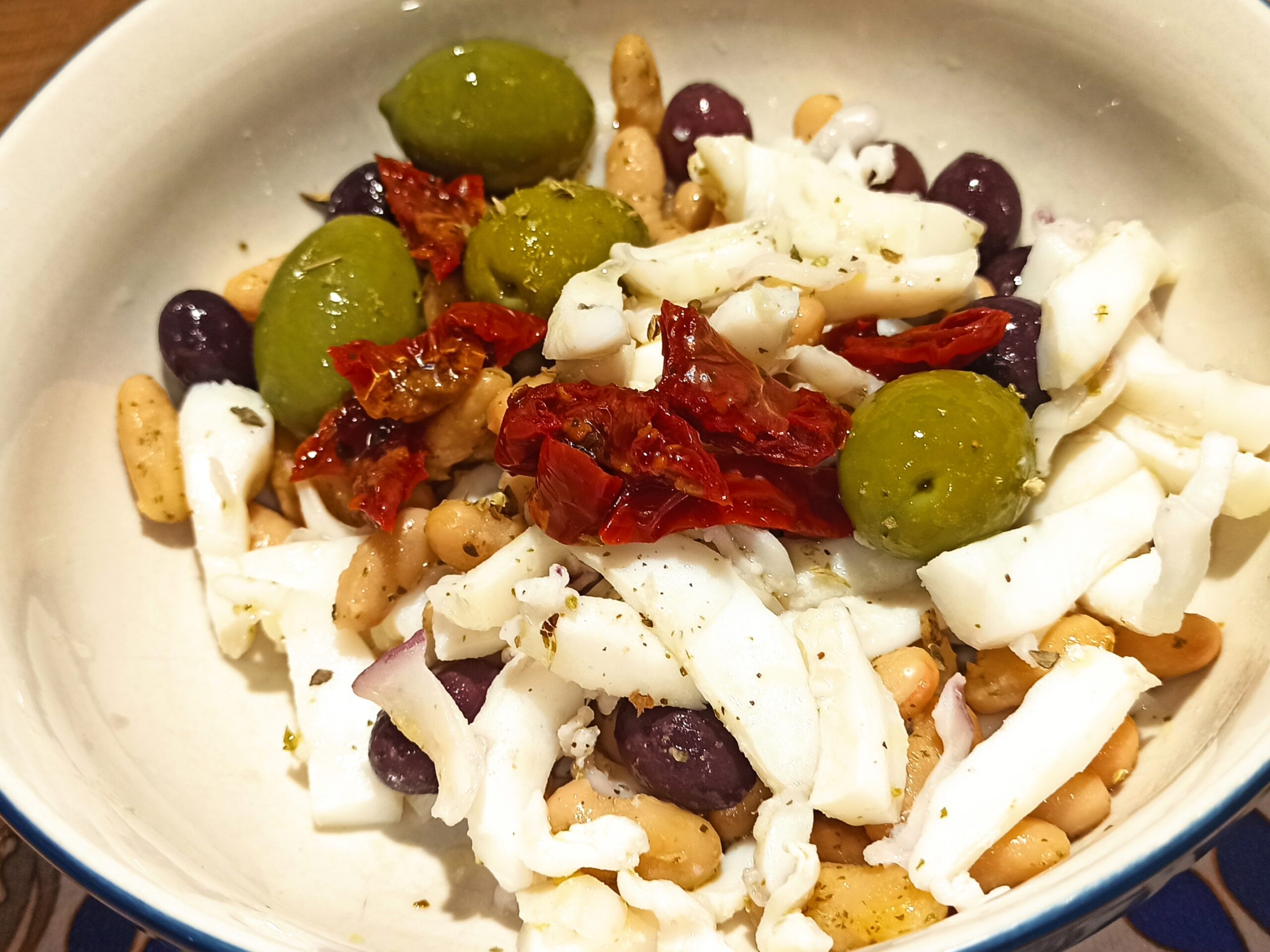 Mettete la seppia in una ciotolina, aggiungete un filo d’olio evo e lasciate insaporire, nel frattempo che i fagioli si raffreddano. Unite i fagioli, ormai freddi alla seppia, aggiungete anche le olive, i pomodori secchi spezzettati, il prezzemolo tritato, ed amalgamate il tutto.