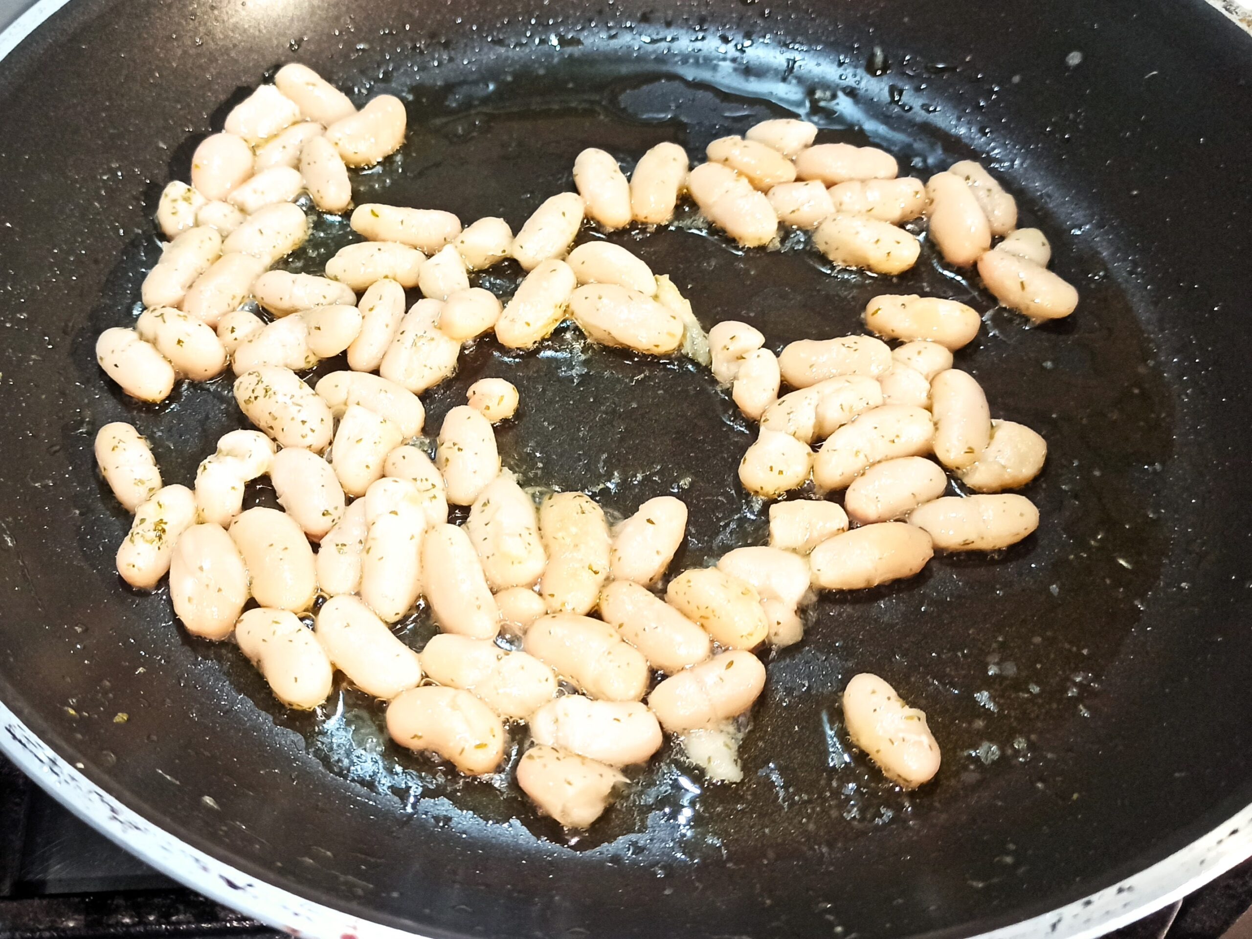 In una capiente padella, mettete un giro abbondate di olio evo, fate imbiondire ed eliminate lo spicchio d’aglio, aggiungete i fagioli sgocciolati, e fate rosolare per un minuto a fiamma media. Poi aumentate la fiamma, sfumate con il vino, se occorre regolate di sale. Appena l’alcol sarà evaporato profumate con l’origano e lasciate raffreddare.