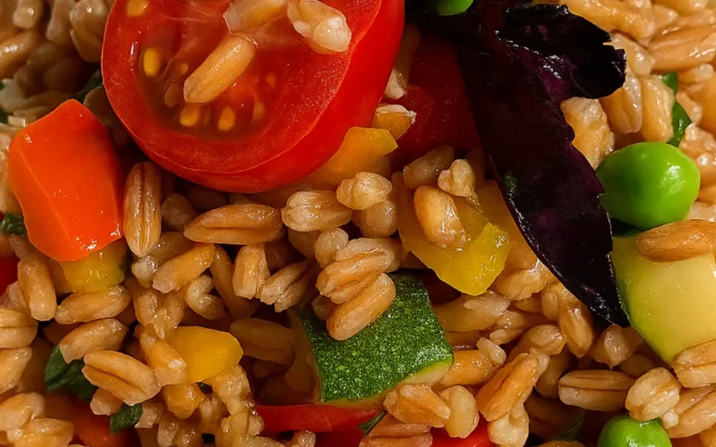 L’insalata di farro con verdure è una scelta eccellente per l’estate, offrendo un piatto leggero, fresco e delizioso che può essere preparato in anticipo e conservato in frigorifero per un paio di giorni. Il farro è un cereale dal gusto ricco, ideale per zuppe invernali e insalate estive. La cuoca ci propone una versione con pomodorini, peperoni, mais, tonno sott’olio e formaggio asiago, ma sentitevi liberi di aggiungere o sostituire ingredienti a vostro piacimento.