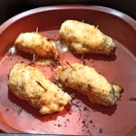 Disponete gli involtini in una teglia, e cuocete per venti minuti a 180° in friggitrice ad aria, girandoli un paio di volte. Poi aumenta a 200° e cuocete per altri cinque minuti.