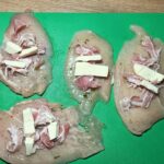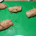 Spennellate la superfice delle fettine di pollo con l’olio aromatico, poi farcitele con la pancetta e i pezzetti di provola.