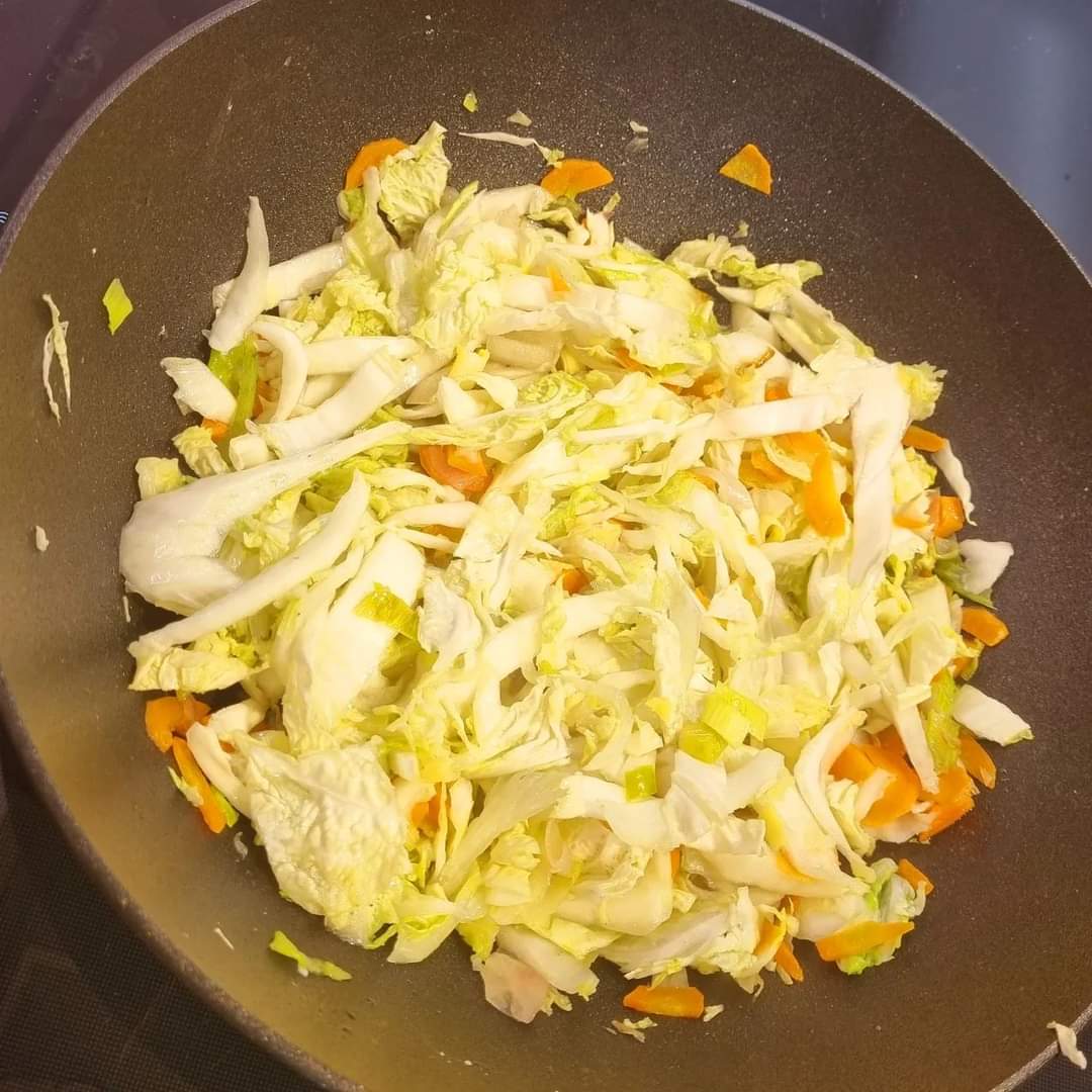 Mondare e tagliare a listarelle sottili il cavolo cappuccio, le cipolle e le carote. Far scaldare la wok a fuoco alto, poi versate l’olio di semi e le cipolle. Soffriggere per un paio di minuti, poi unire le carote e il cavolo cappuccio.