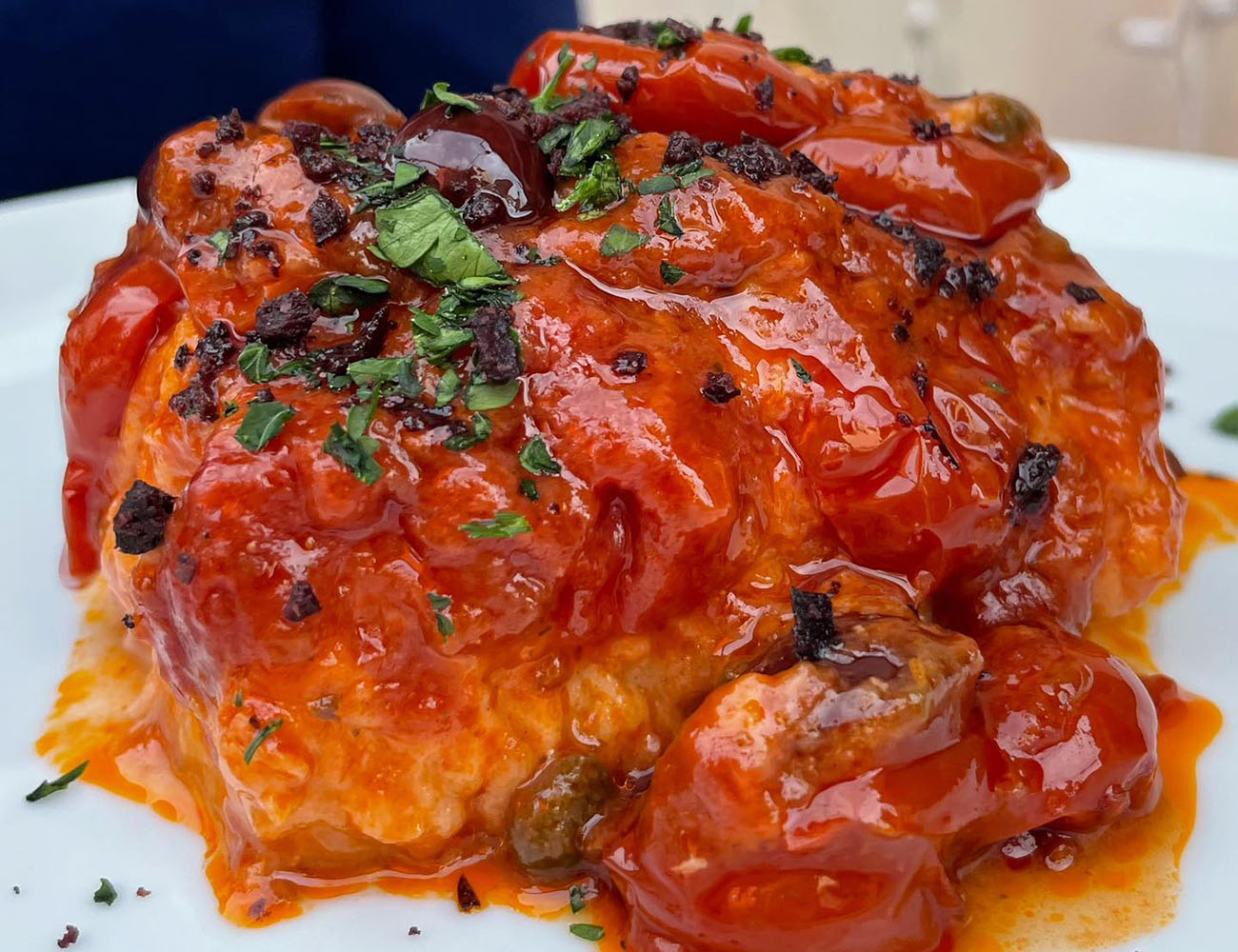 Risciacquate i capperi dal sale, asciugateli e aggiungeteli alla passata di pomodoro insieme ai pinoli, alle olive e all’uvetta strizzata. Aggiustate di sale secondo gusto e lasciate cuocere per qualche minuto. Unite il baccalà fritto e le patate lessate alla salsa, facendo attenzione a mescolare delicatamente per non rompere i pezzi di baccalà.