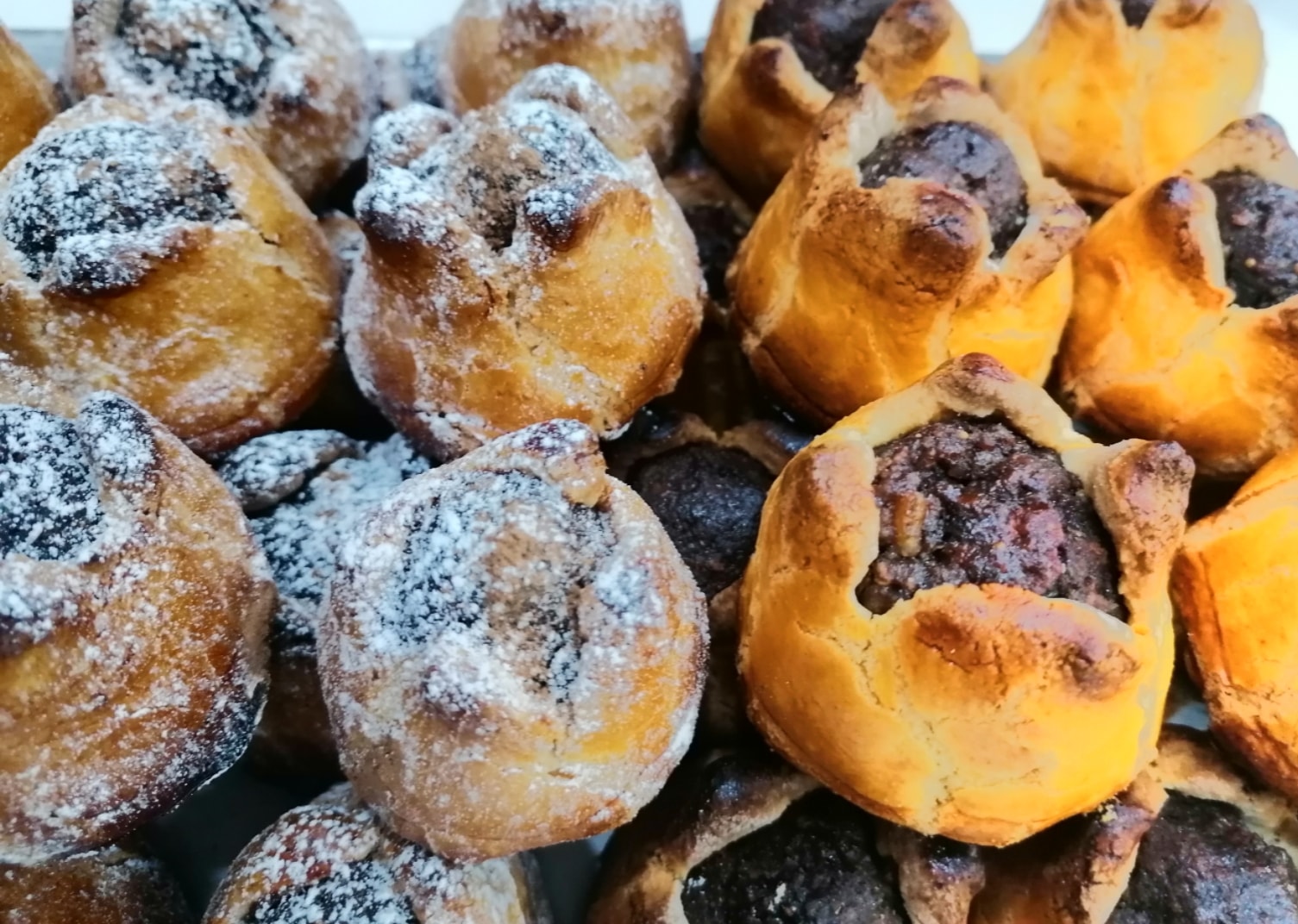Passate quindi alla preparazione del ripieno. Tritate la frutta secca e versatela in una ciotola con un po’ di cannella, marmellata, scorza d’arancia, uva passa, fichi, noci, cioccolato fondente, mandorle tritate e l’uovo e mescolate il tutto amalgamando. Su ogni dischetto mettete un cucchiaio di impasto del ripieno e chiudete i margini della pasta frolla creando una sorta di forma a stella. Infornate a 150°C per circa 40 minuti. Noterete che mentre i dolcetti si cuociono, inizieranno a schiudersi e si noterà il ripieno. Quando saranno cotti, fateli raffreddare e fate una bella spolverata di zucchero a velo.