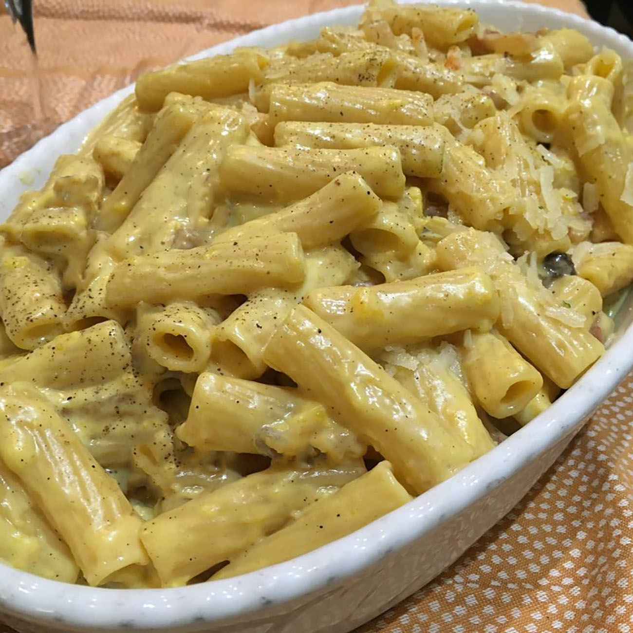 Avete presente la carbonara? Diciamo che qui c’è l’idea, ma non di fatto non è proprio una carbonara. Formaggio, uova si, ma senza la “ciccia”, la carne. Buonissima, non c’è che dire, un’idea del cuoco contadino Giorgione, quindi sicuramente gustosa e buonissima, ma per gli amanti ( anzi, gli ossessionati) della carbonara questa ricetta potrebbe risultare davvero “un’eresia”.