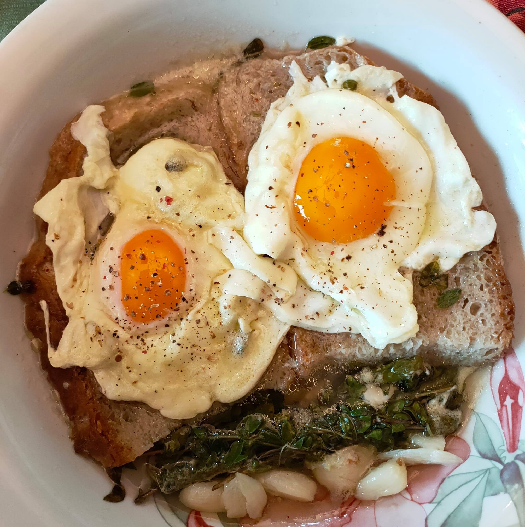 Fate sobbollire tutti gli ingredienti insieme per circa 8 minuti fino a far insaporire per bene l’acqua creando una specie di brodo. Successivamente, mettete a cuocere per circa 2-3 minuti le uova in camicia direttamente nel brodo che avrete ottenuto con l’aglio e le erbe versando un uovo per volta. Nel mentre, affettate il pane raffermo, abbrustolite le fette e su ognuna, se gradite l’aglio strofinatelo, altrimenti condite solo con pepe, sale e olio evo.