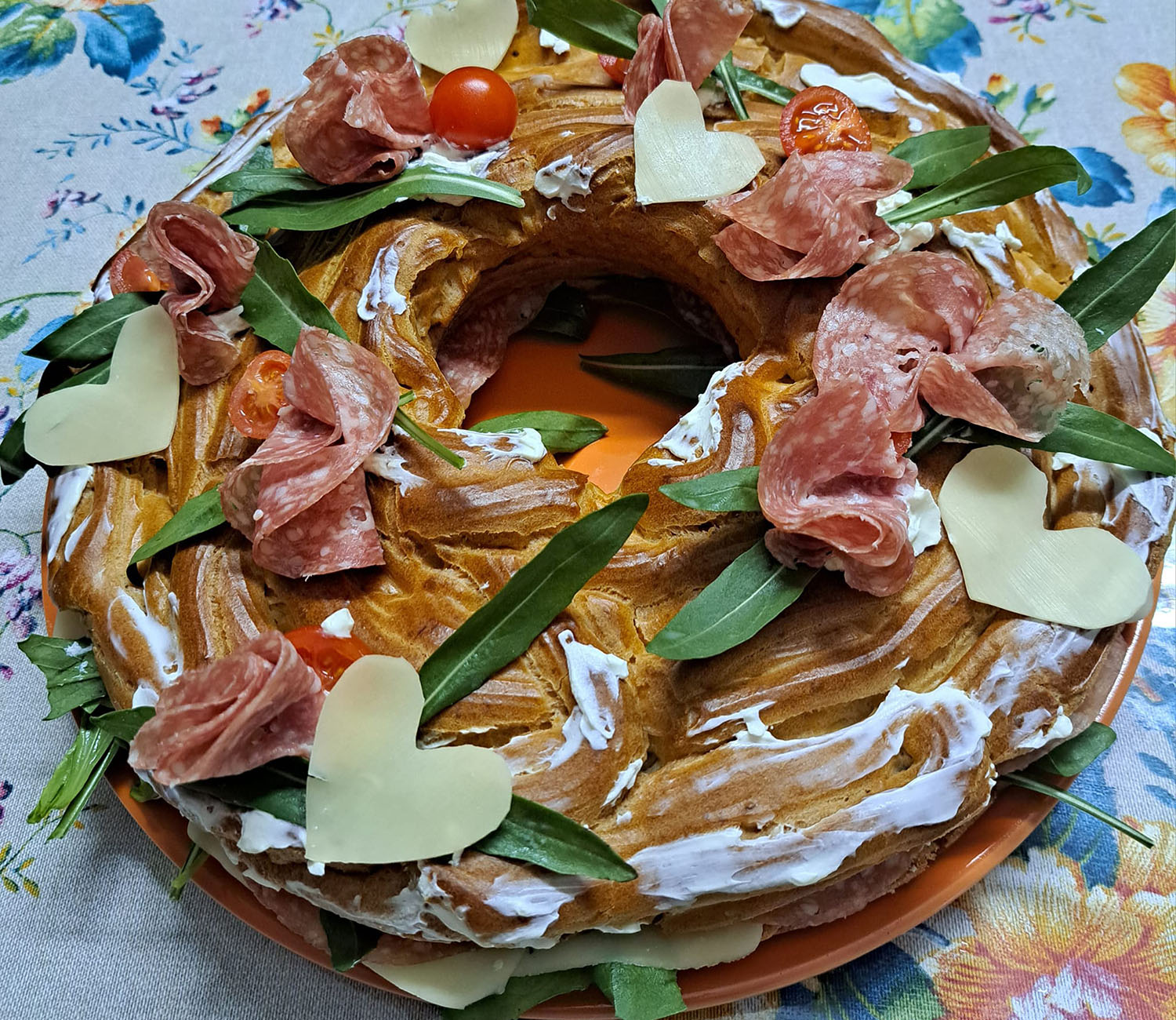 Lo zeppolone salato è un antipasto bello da vedere e buono da mangiare. La Pasqua si avvicina e già siamo alla ricerca delle ricette più belle per arricchire la tavola. Perché durante le feste anche l’occhio vuole la sua parte. E che bell’effetto che fa una tavola imbandita con questo buonissimo centrotavola. La consistenza ricorda quella del paris brest, un dolce francese che si prepara con la pasta choux. La comodità sta nel fatto che potete preparare la base anche il giorno prima, per poi farcirlo al momento di presentarlo in tavola. Per l farcitura noi abbiamo scelto determinati ingredienti, ma potete variare usando quello che avete in casa.