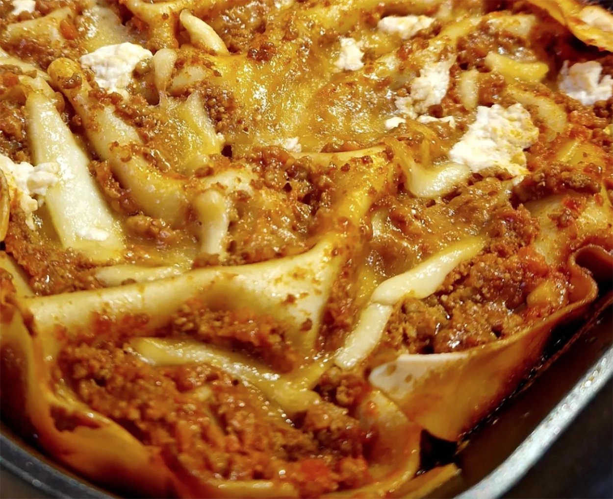 Adesso che abbiamo tutto pronto assembliamo. Quindi prendiamo una teglia e facciamo uno strato di sugo e uno di besciamella. Adagiamo un letto di fogli di lasagna. Poi poniamo sulle fette di fior di latte, della ricotta, sugo e besciamella. Arriviamo fino all’ultimo strato e completiamo con il sugo, dei fiocchi di ricotta e una spolverata di parmigiano.