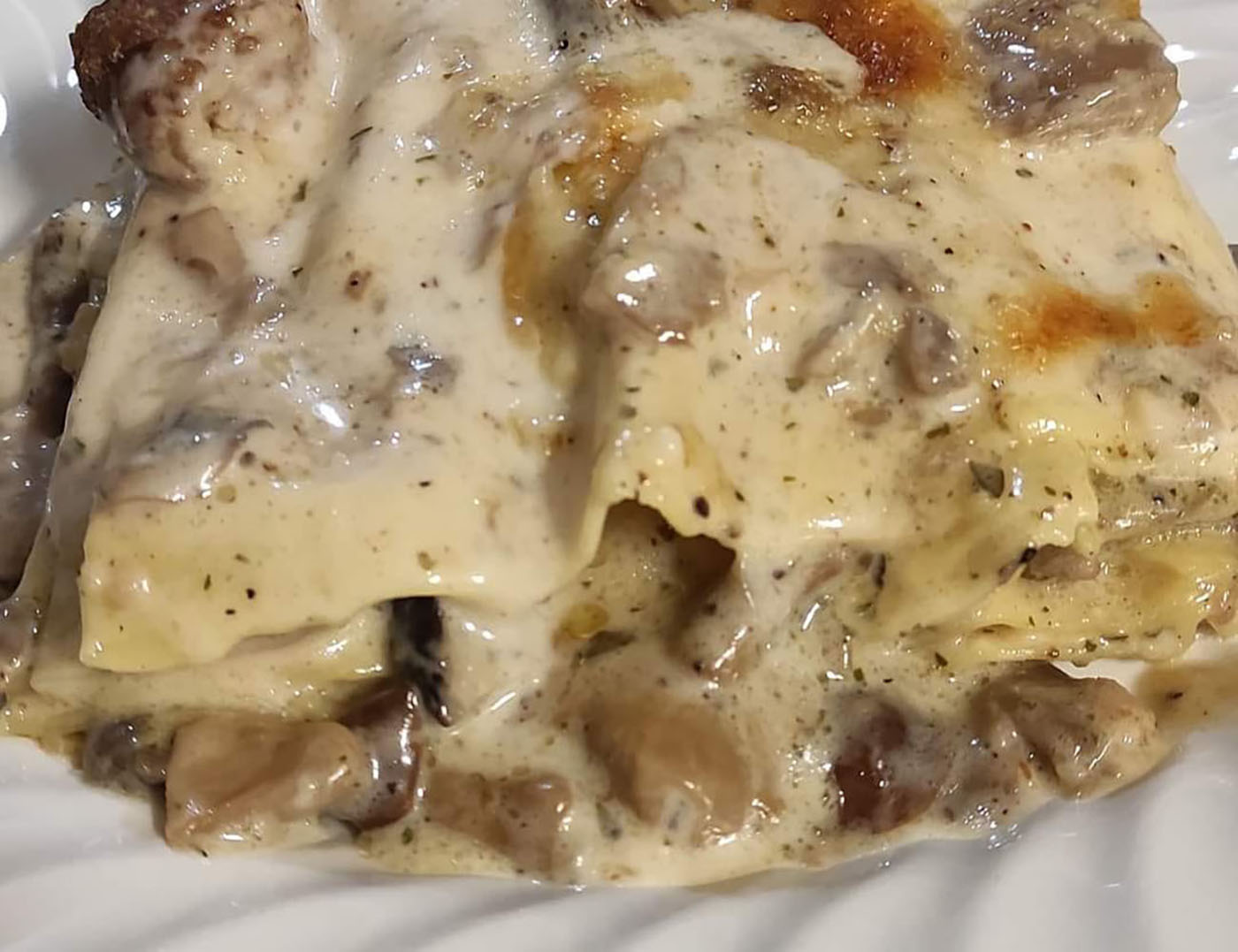 Aggiungete i funghi tenuti da parte distribuendoli a piacere e cuocete le lasagne in forno statico preriscaldato a 180 °C per 30-35 minuti. Infine, sfornate e servite la vostra delizia calda e filante! Se volete una versione più ricca ma non più vegetariana, potete aggiungere anche dei pezzettini di speck nel soffritto fatto in precedenza insieme ai funghi. Il risultato sarà davvero delizioso. Buon appetito!