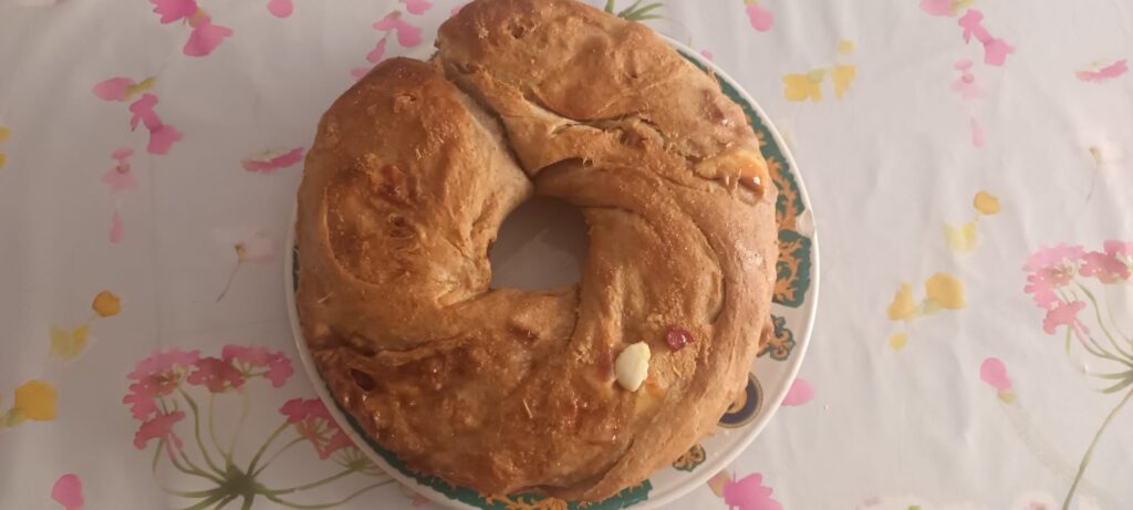 Tradizione vuole che le uova intere con guscio vengano incastonate sulla superficie e “ingabbiate” con due striscioline d’impasto a croce. È il simbolo della Pasqua!