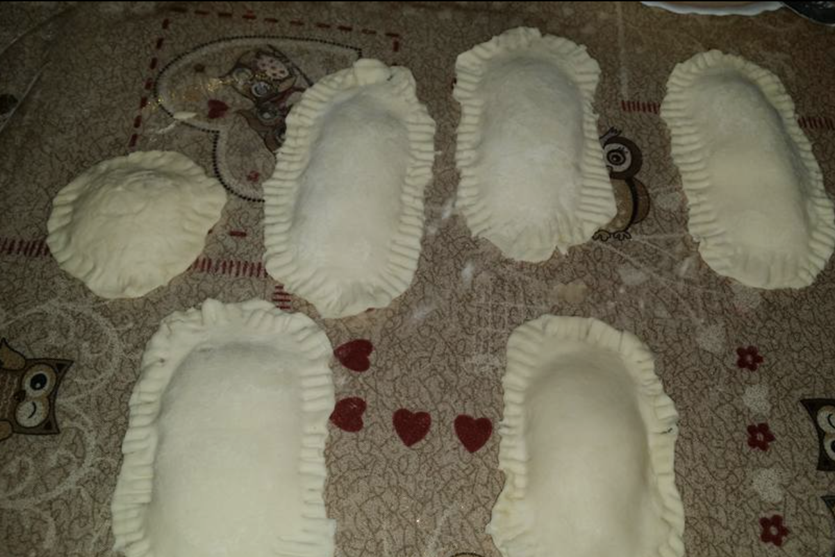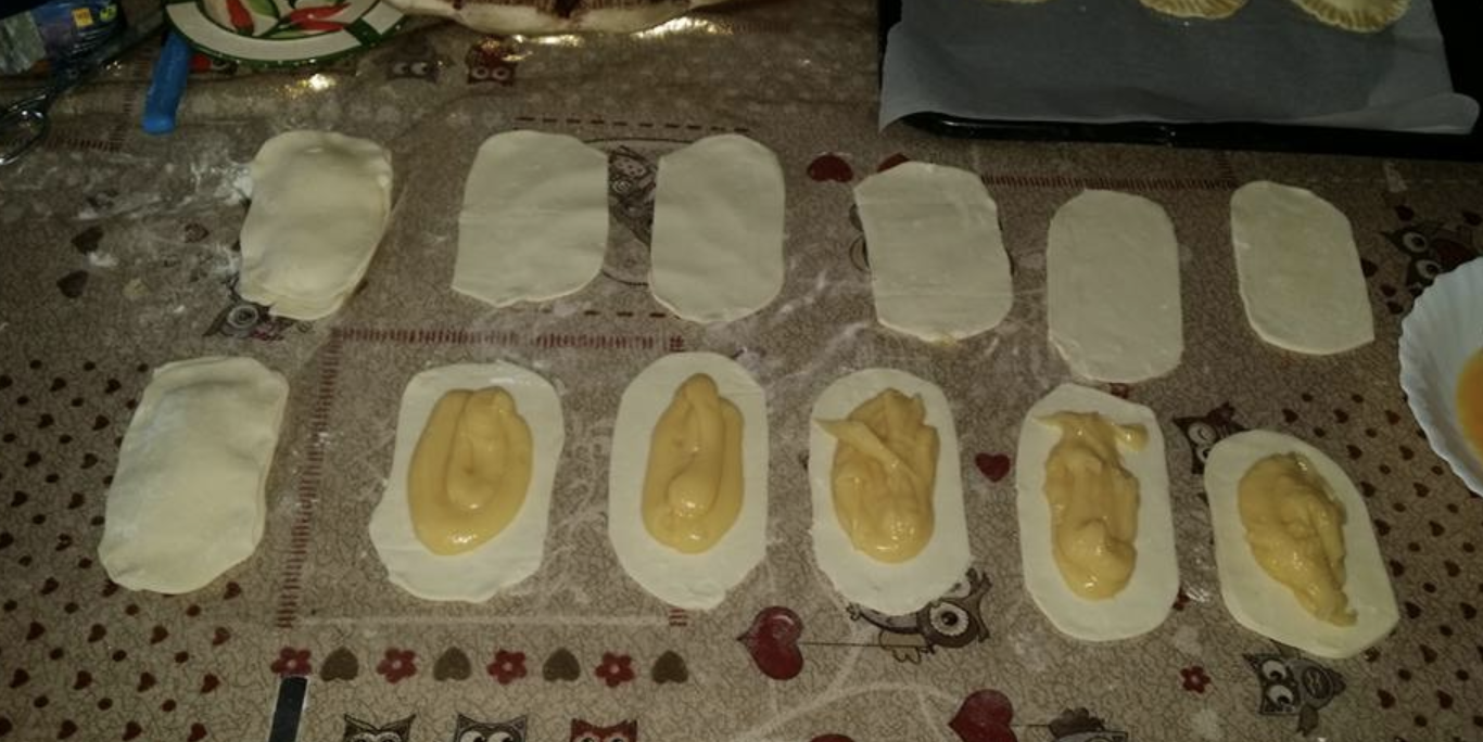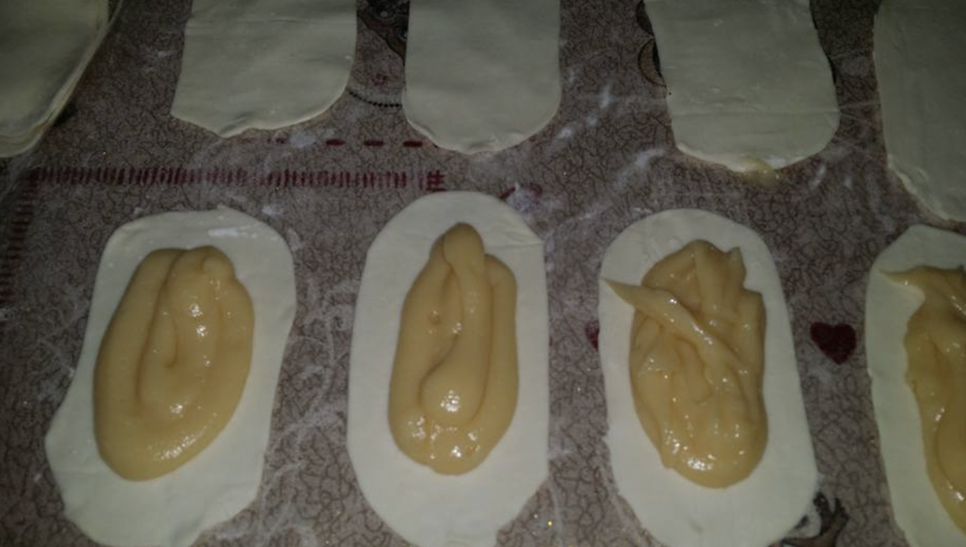 Stendere la pasta sfoglia, praticando dei forellini al fine che non rigonfi durante la cottura; formate degli ovali lunghi 15 cm e larghi 8 cm.