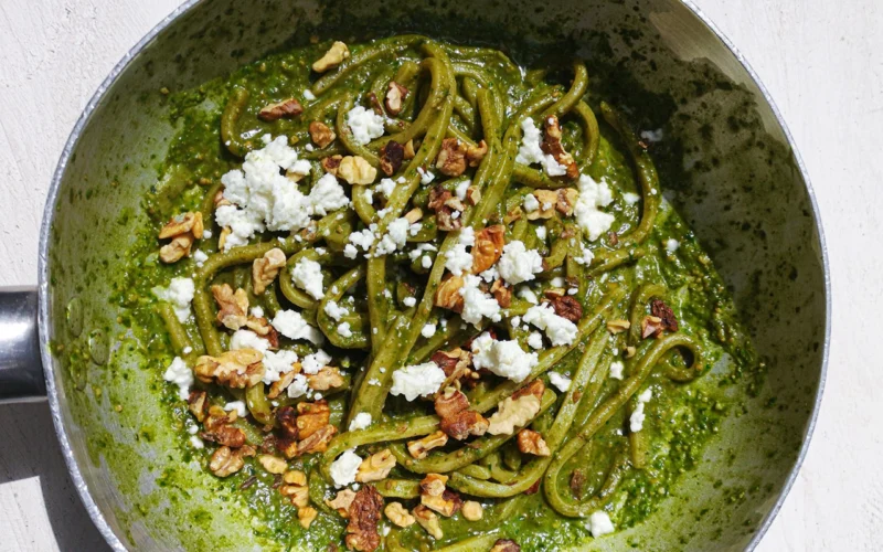 Linguine al pesto di basilico profumato al limone con feta e noci tostate: Un primo piatto fresco e sorprendente. Il pesto di basilico con scorza di limone regala un aroma unico, la feta greca aggiunge sapiditร e cremositร , mentre le noci tostate donano croccantezza e un gusto deciso. Perfetto per una cena estiva o per stupire gli ospiti con un abbinamento speciale.