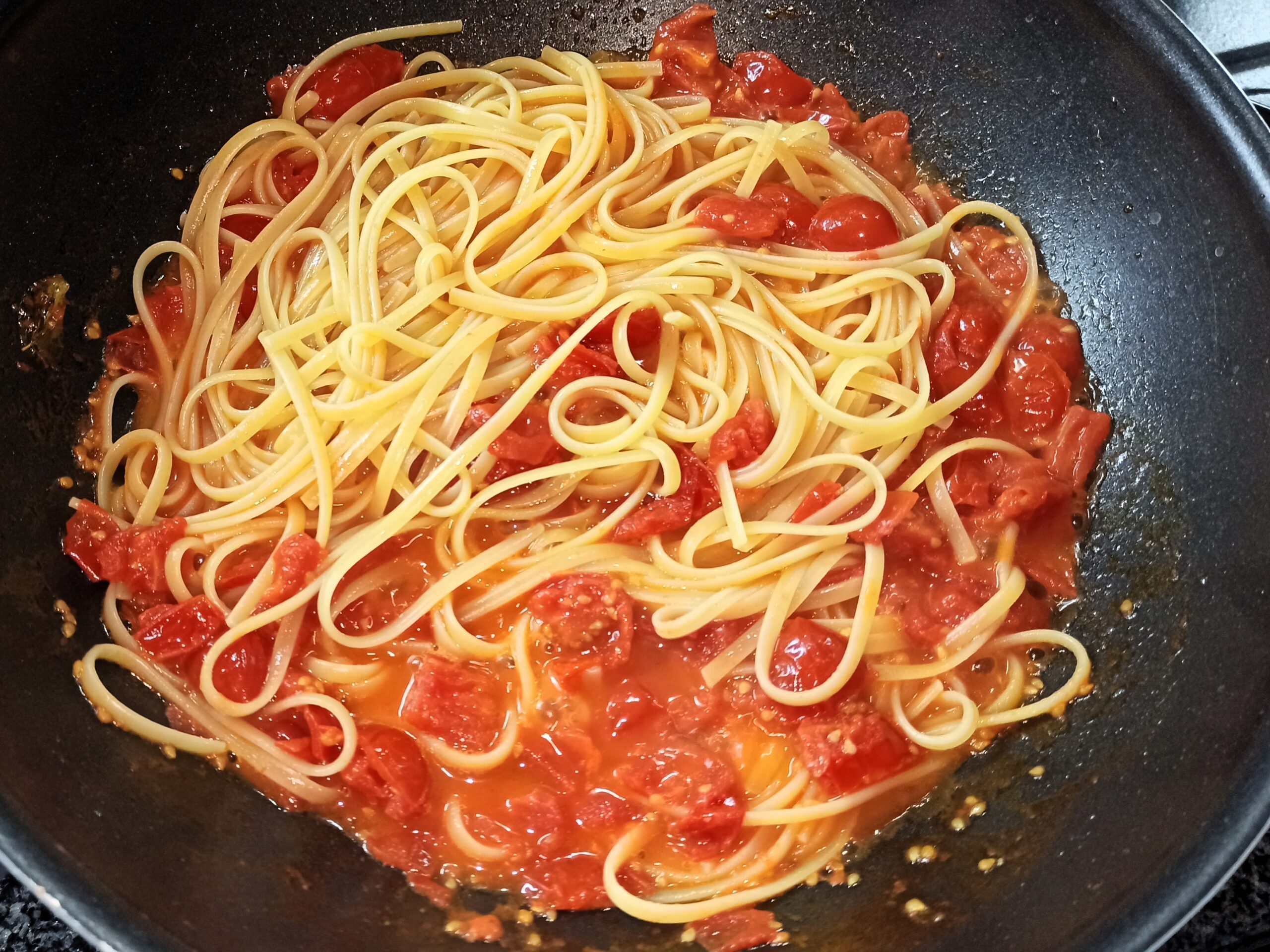 Appena l’aglio sarà imbiondito eliminatelo, ed aggiungete i pomodorini. Fate cuocere a fiamma media, appena inizieranno ad appassire, aggiungete il liquido rilasciato dai lupini, le foglioline di basilico spezzettate, e se occorre un poco d’acqua di cottura della pasta.